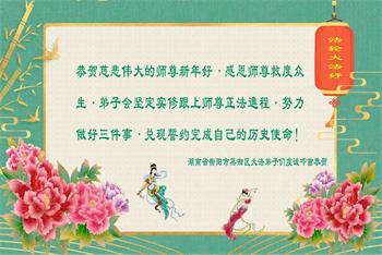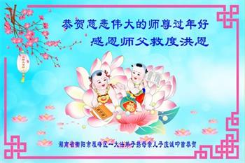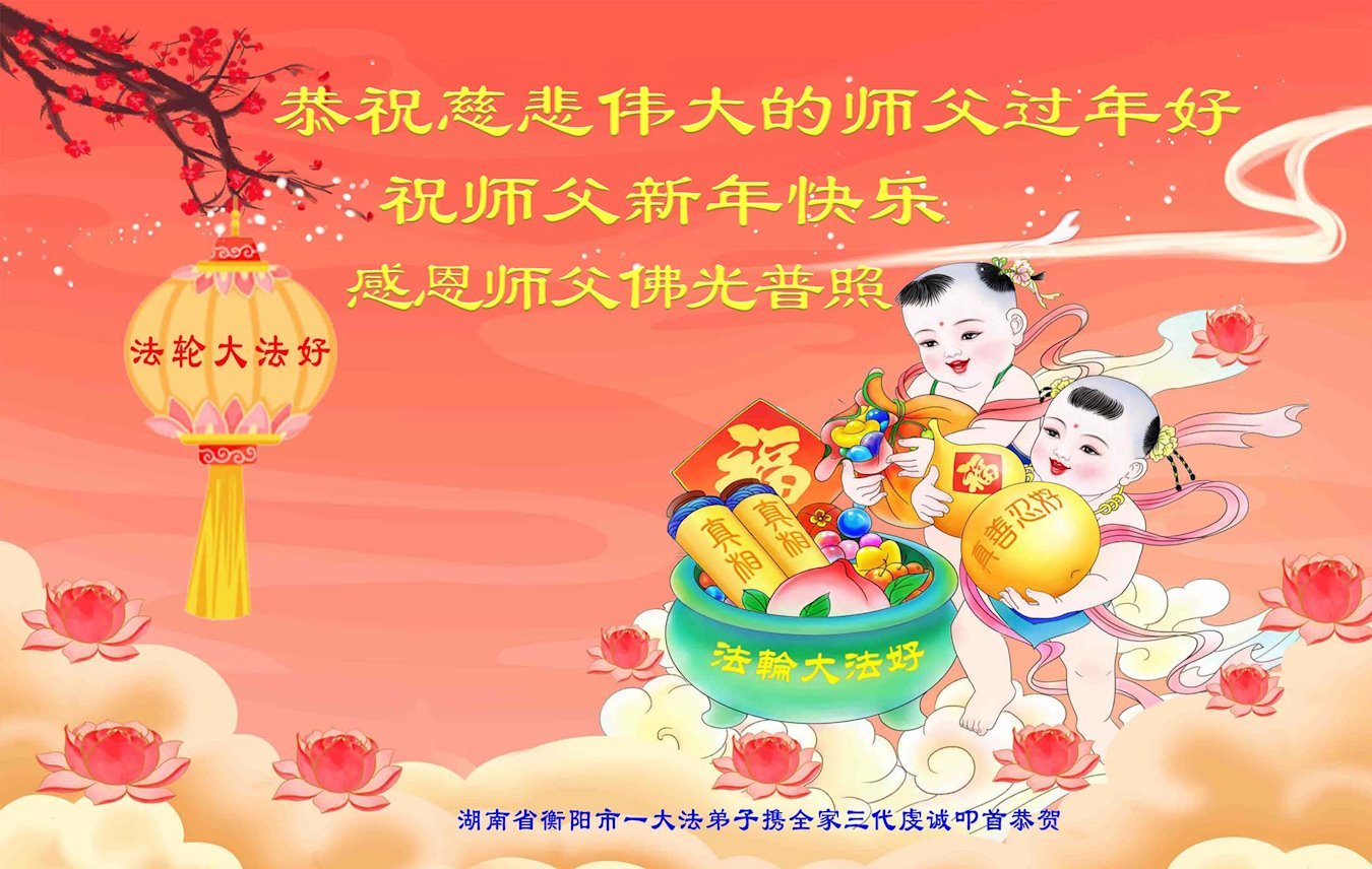 在二月十二日大年初三发表的一则题为《明真相得厚福 中国民众给李大师拜年》的组合中,湖南省娄底地区一家人写道:我们全家人看过法轮大法的许多真相资料,知道法轮大法是济世普度的真法真道,而且我们全家多次受益于大法。每当意外难关降临,我们第一念就赶紧诚心敬念“法轮大法好,真善忍好”,次次都化险为夷。河南省许昌市几家大法弟子的家属表示:我们知道中共对大法的舆论宣传,都是对大法和大法弟子的诬陷。我们明白了法轮功真相,得到了您的慈悲救度,身体健康,家庭和睦。我们非常支持大法。在新的一年里,我们还要宣传大法,弘扬大法。