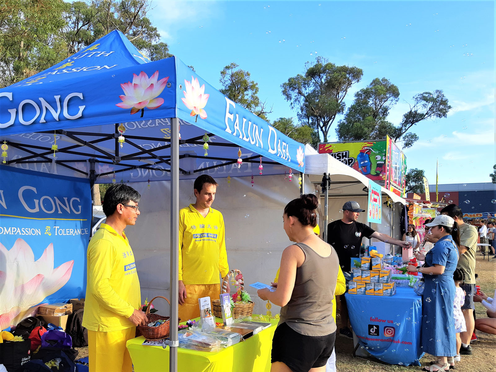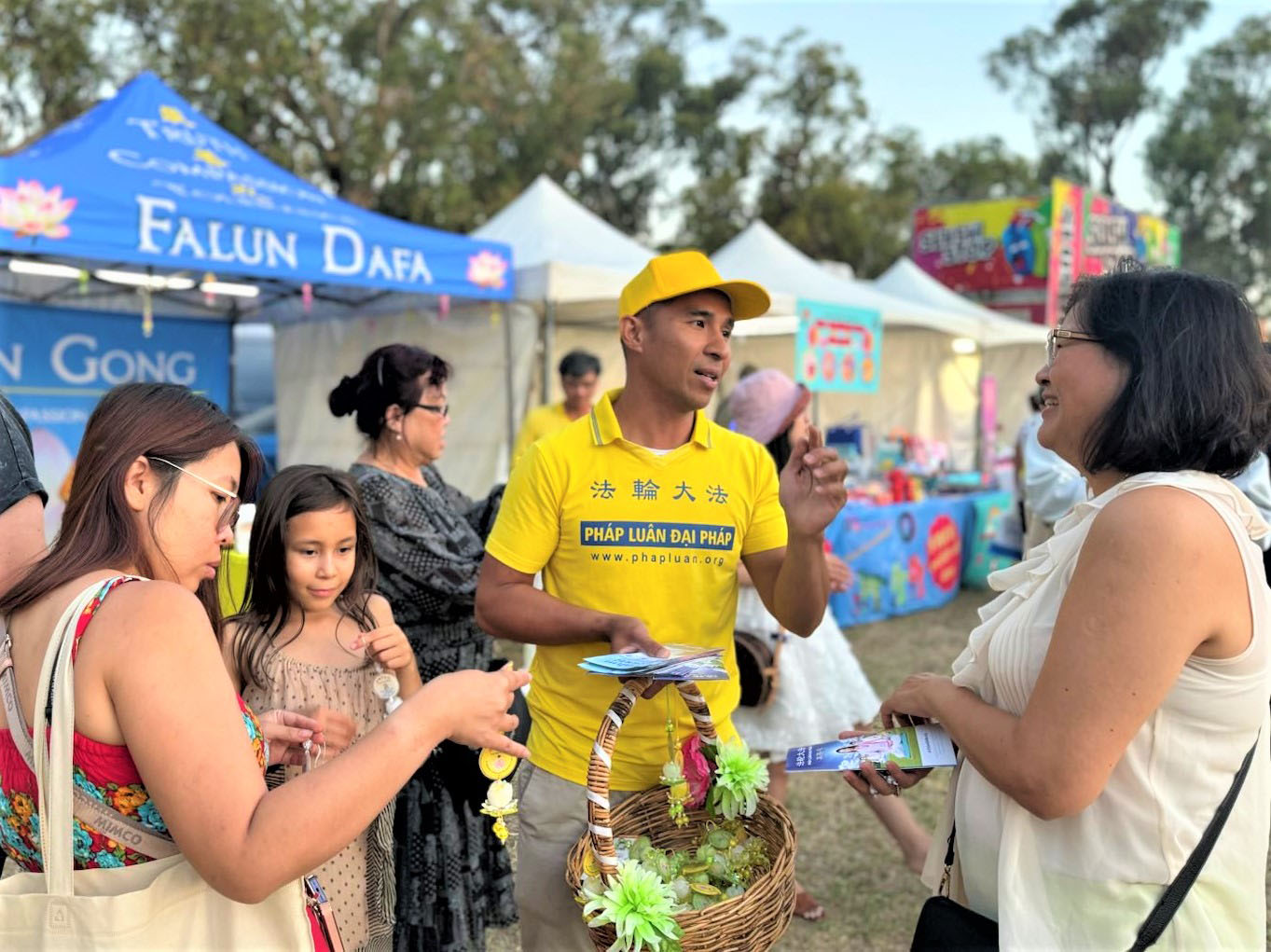 来自越南社区的阮雅(Nga Nguyen)和朋友来到法轮功展位前,感到一种积极向上的氛围,她与展位上的越南裔学员交谈,并接下真相资料。她表示:“真、善、忍很美好,每个人都会从中受益。”