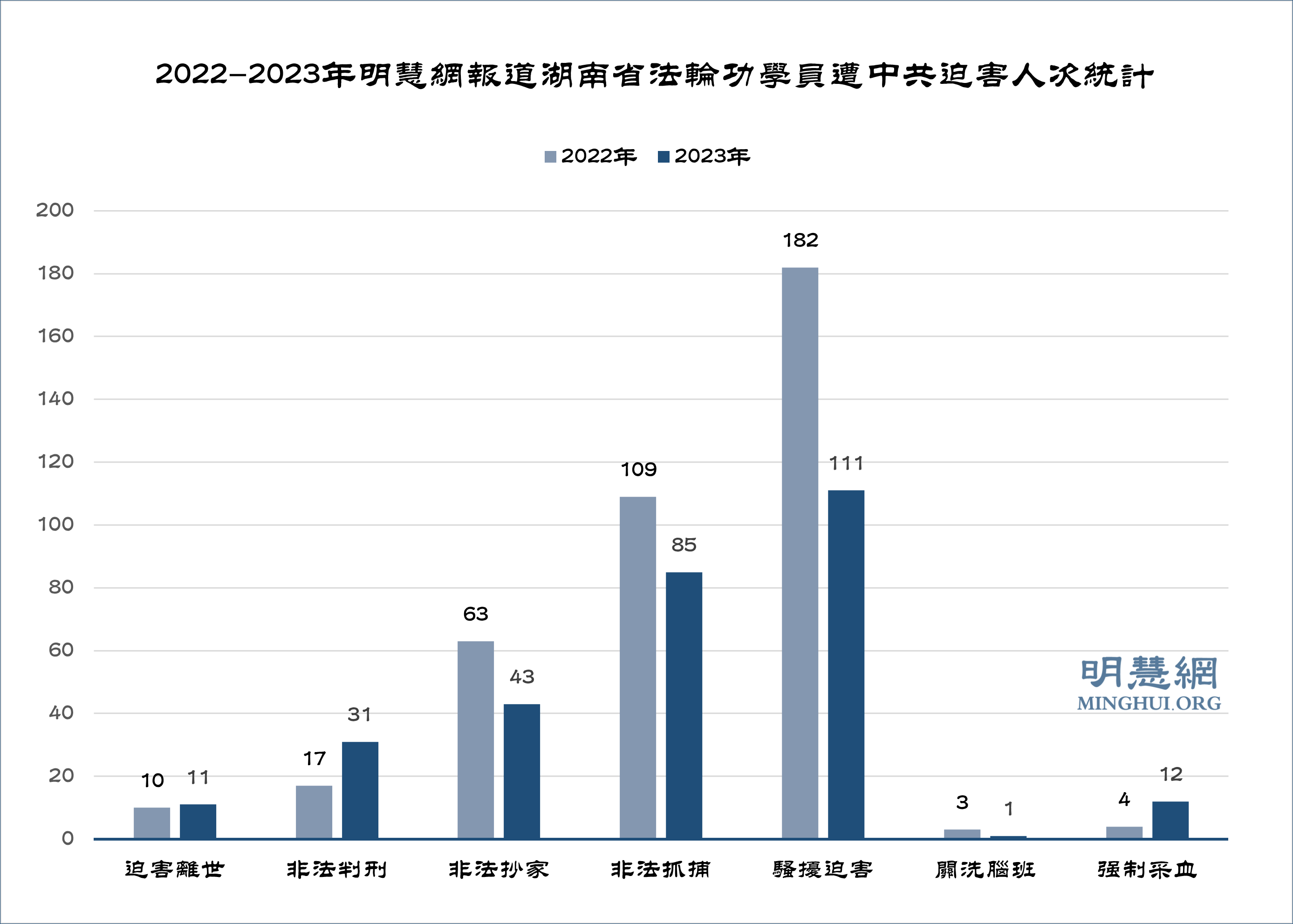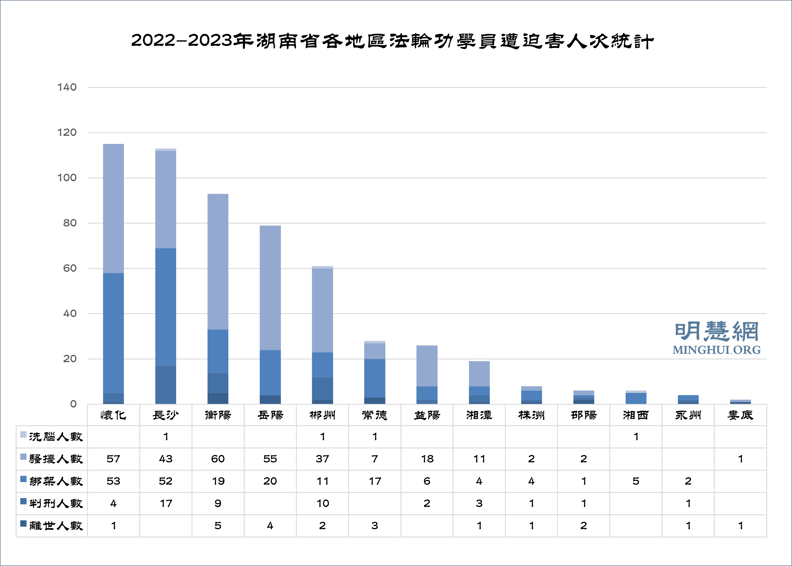 ![]() 图1:2022-2023年明慧网报道湖南省法轮功学员遭中共迫害人次统计 |