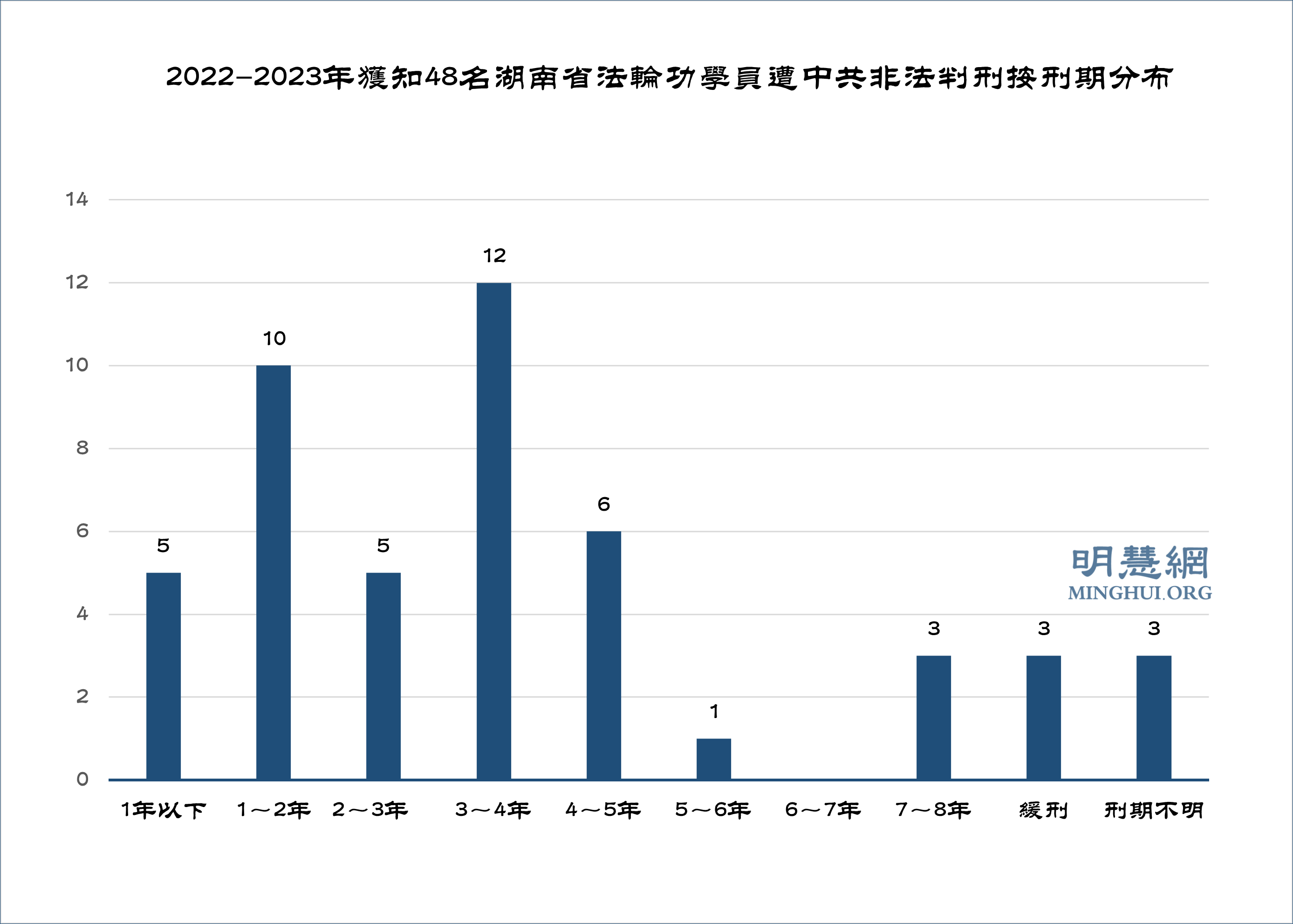 ![]() 图3:2022-2023年获知48名湖南省法轮功学员遭中共非法判刑按刑期分布 |