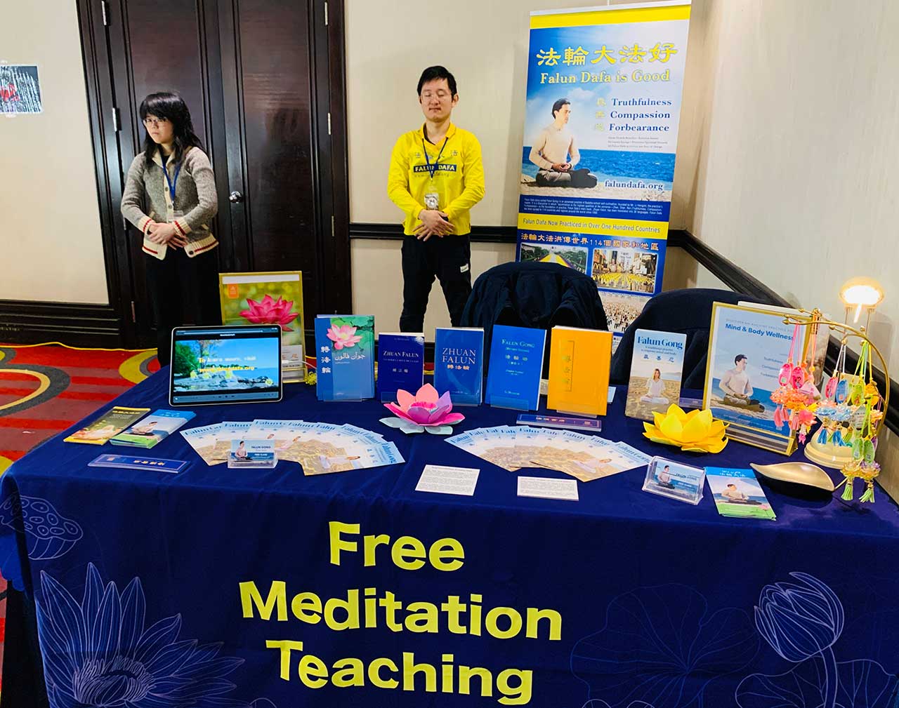 在法轮大法的展位上,展览了中英文及其它文种的《转法轮》书籍、明慧国际杂志和功法的介绍资料。来展位了解功法的观众纷纷现场学炼了五套功法,亲身感受了炼功带来的身体变化;也有观众听到学员讲述家人因修炼法轮大法而被中共迫害,不禁感伤落泪;有观众接到传单后,回忆起曾经到大法展位学炼过功法;也有观众在了解法轮功能帮他们获得平静的心灵和健康的身体,便不停询问,想要得到更多信息;有观众说自己购买了大法书籍,已经开始阅读了。