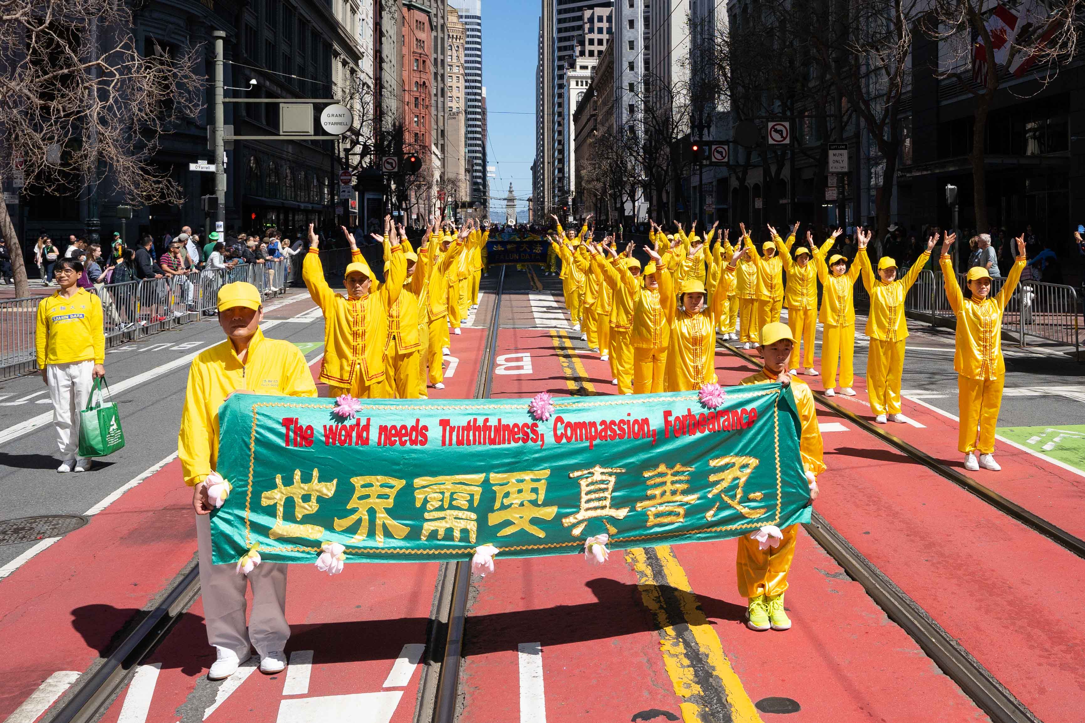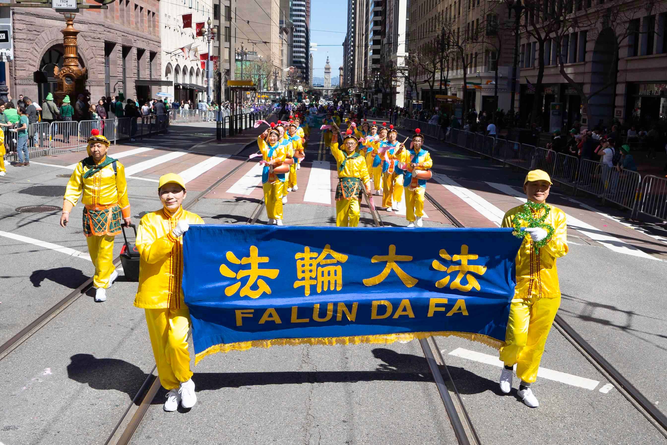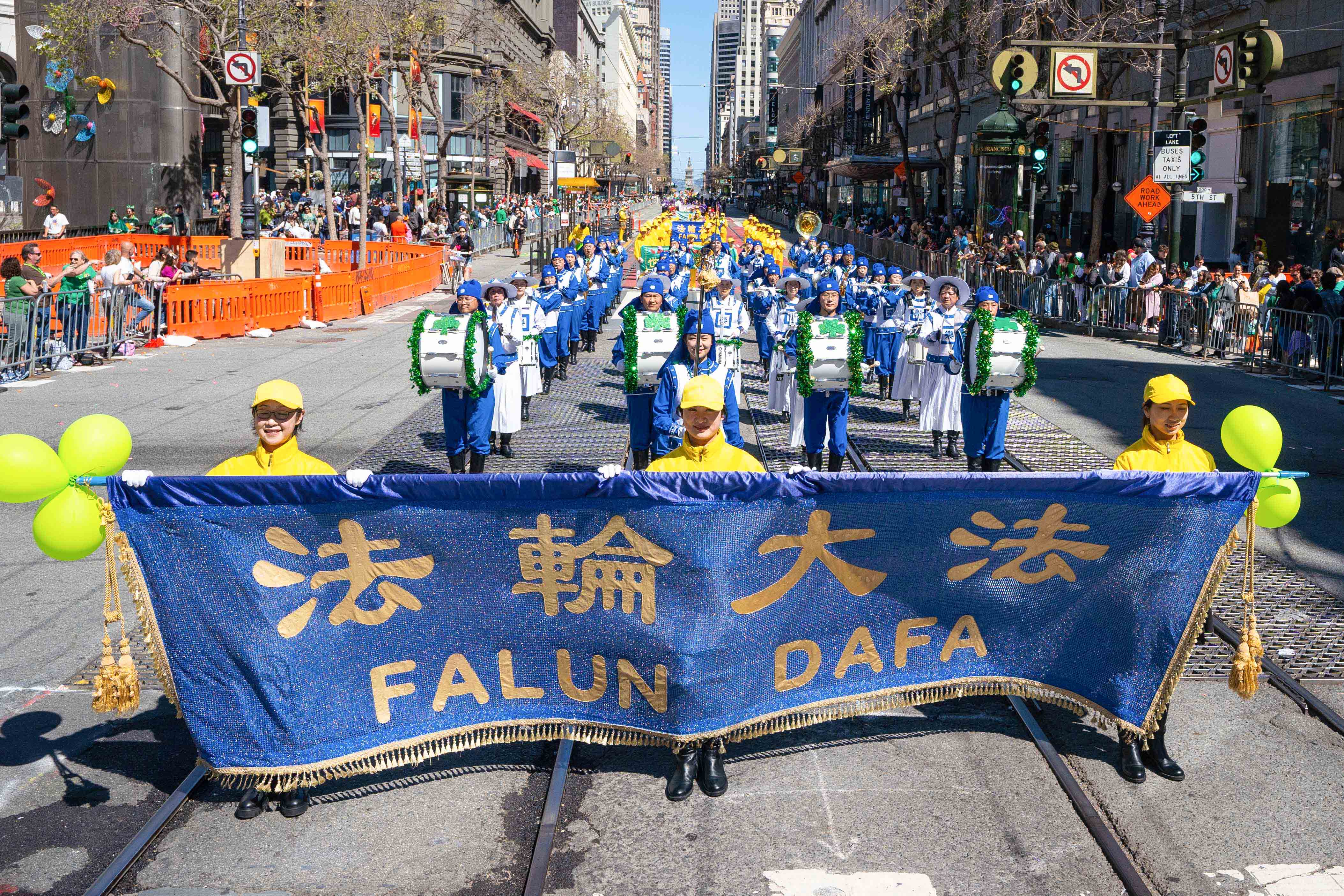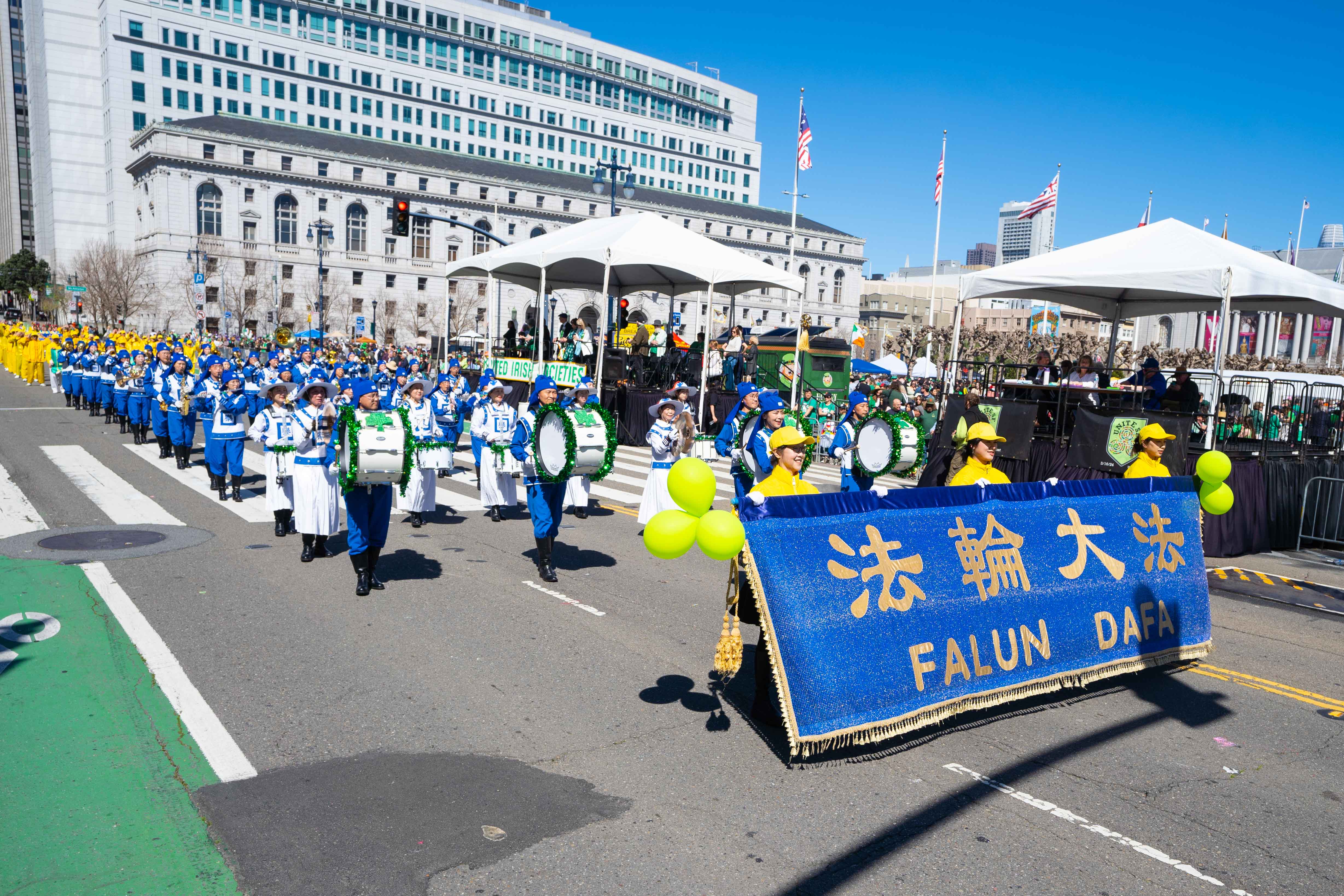 参加旧金山圣帕特里克日游行的法轮功学员队伍是历年来阵容最大的,有法轮功炼功队、腰鼓队和美西天国乐团。许多观众随着天国乐团演奏的雄壮乐曲舞蹈着;有的高兴地跟法轮功学员的队伍一起拍照留念;还有的观众向法轮功学员竖起大拇指。