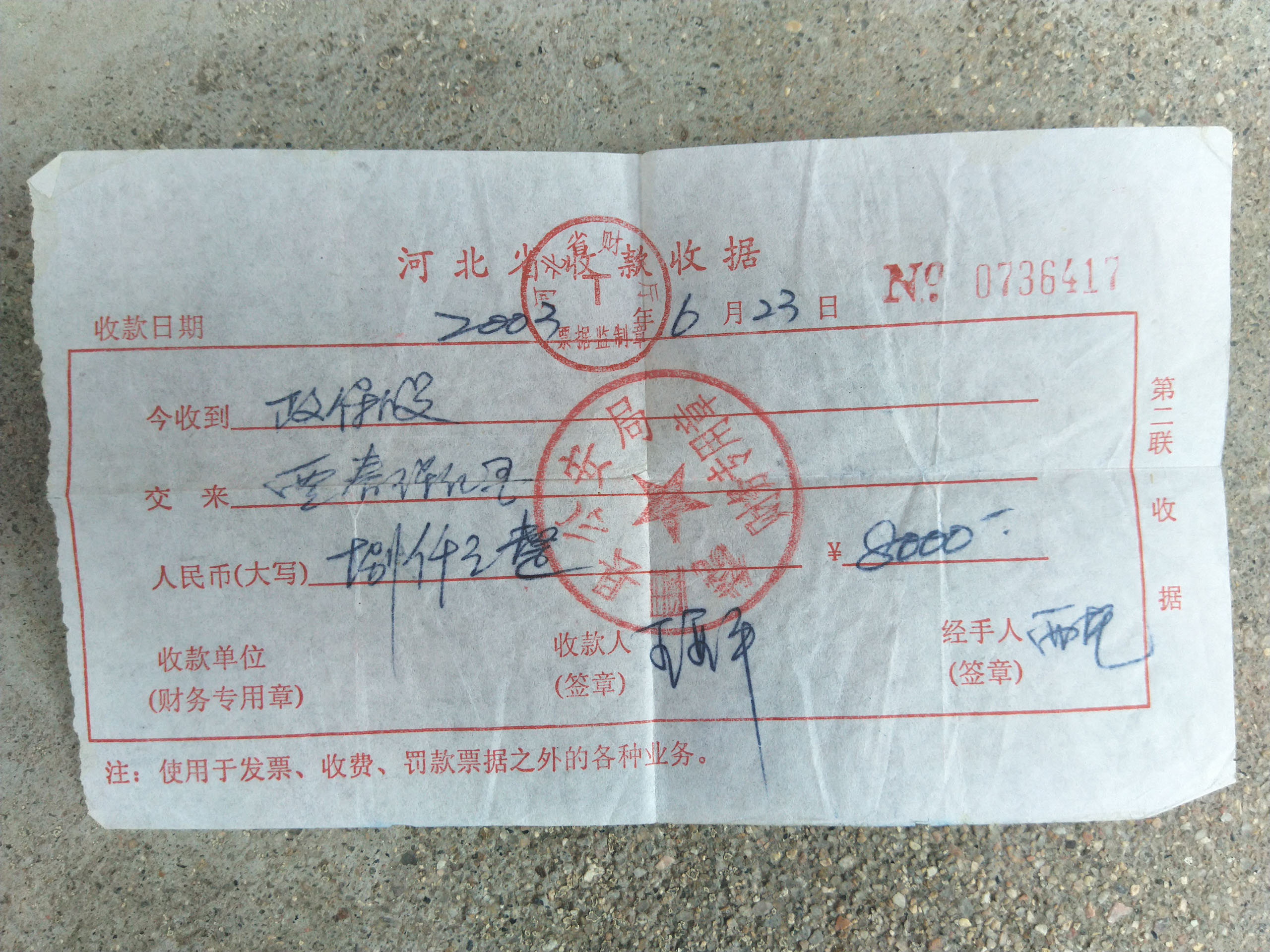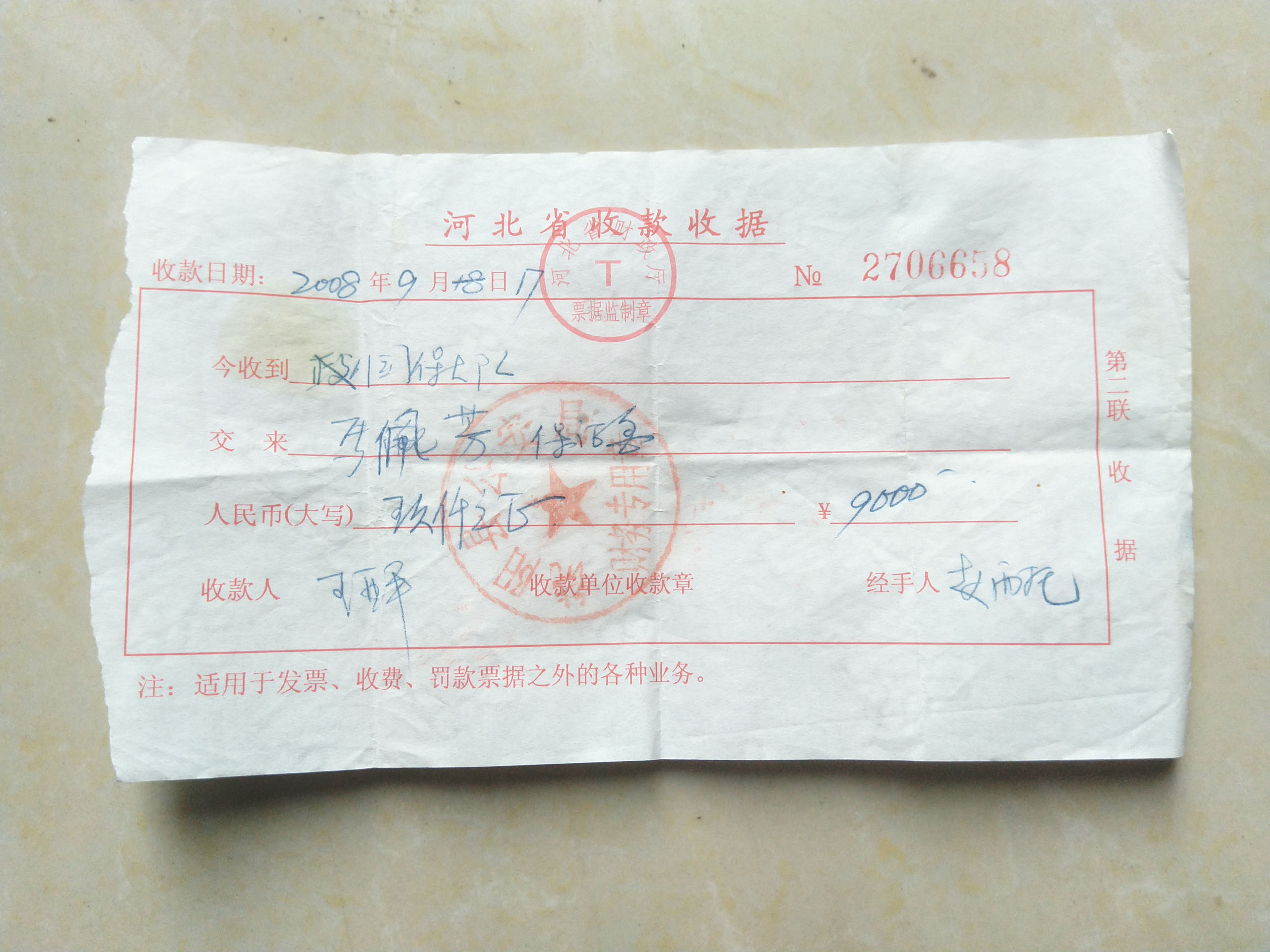 ◎二零零零年十月,法轮功学员马秀艳被饶阳县公安局警察绑架在饶阳县看守所,后又转到武强县看守所。被关押一个多月后,不让回家,被迫到饶阳县邪党校洗脑班两个多月。此次,马秀艳家人被勒索五百元办班费、12000元保证金。收据有特勤中队队长刘彦楼签名(有证据),国保队长国铁檩、魏跃辉。单据上的马培艳就是马秀艳。
