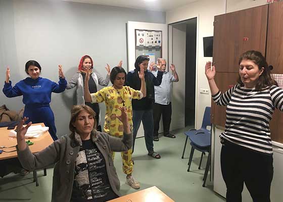 3月19日至22日,一名法轮功学员在荷兰泰尔·阿佩尔难民营,向从世界各地战乱区中逃离家园、来到此地的难民们介绍法轮功、义务教功。
