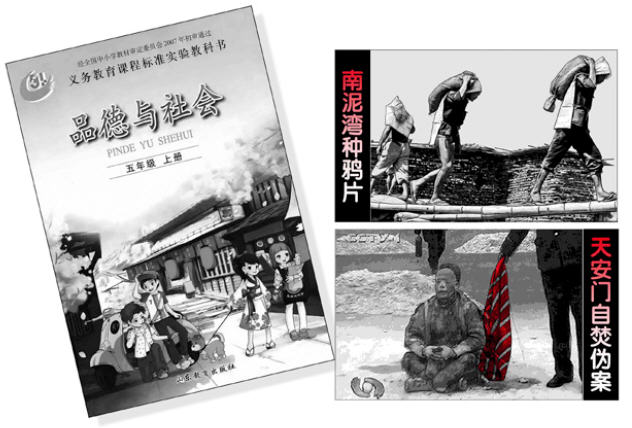 再比如,二零一零年,山东教育出版社出版的《品德与社会》 五年级上册,利用2001 年中共自导自演的世纪骗局“天安门自焚”欺骗小学生,从小就煽动孩子对法轮功信仰群体的仇恨。