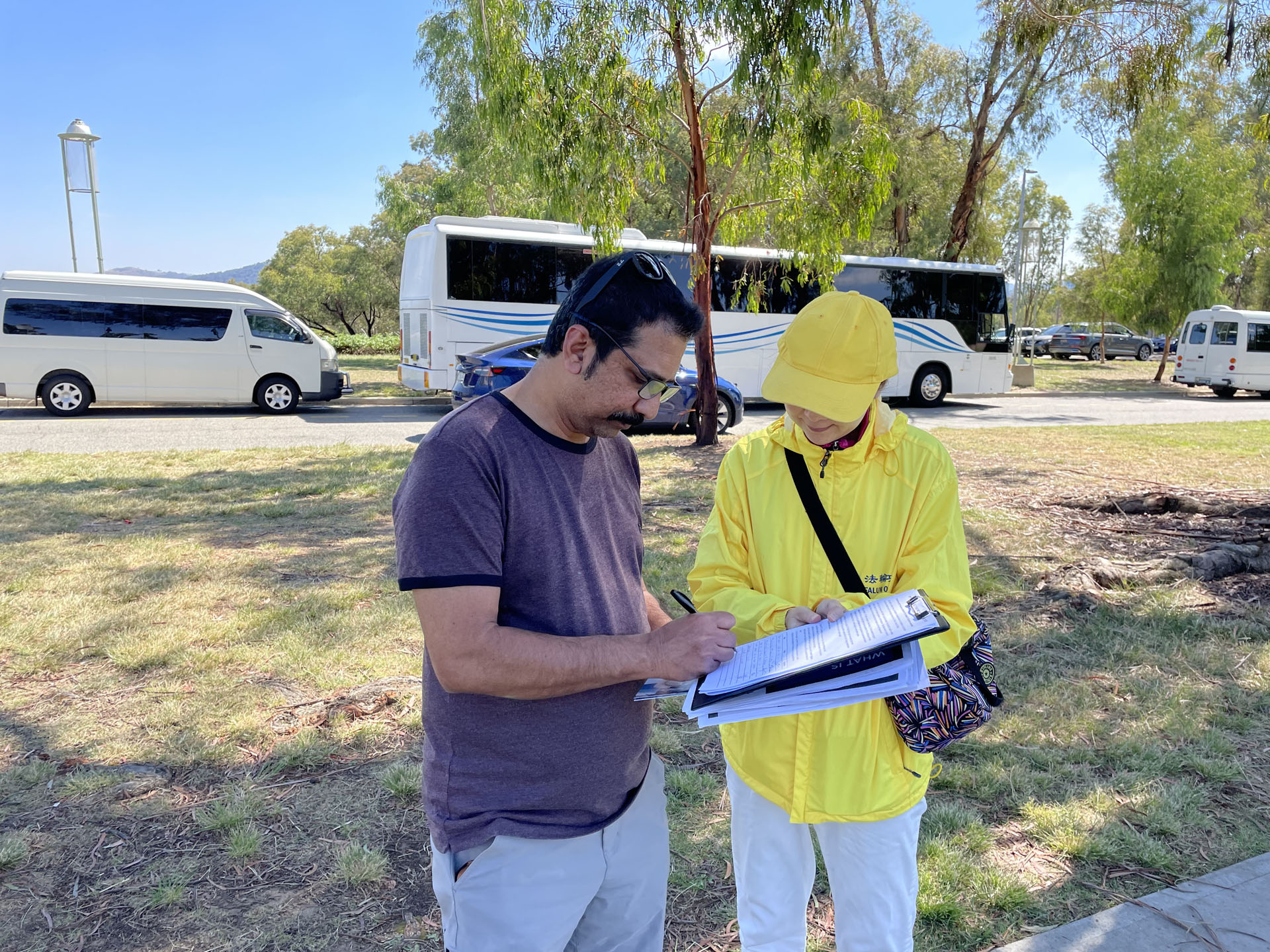 美国一家医院的医师吉泰什·查加斯(Jithesh Chungath),携家人来澳探亲度假。当天参访国会大厦时路过集会现场,和法轮功学员攀谈后,在请愿信上签了名。
