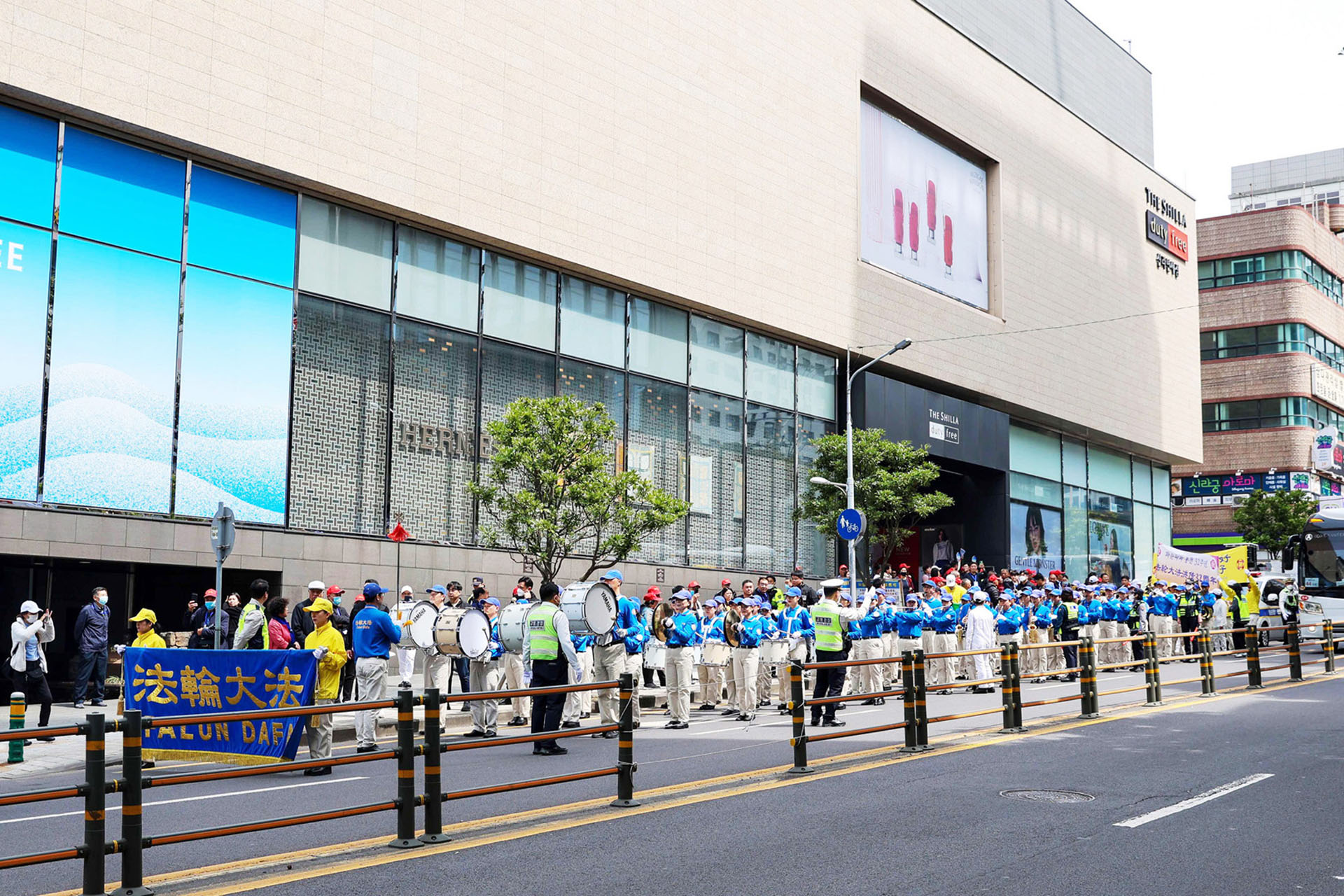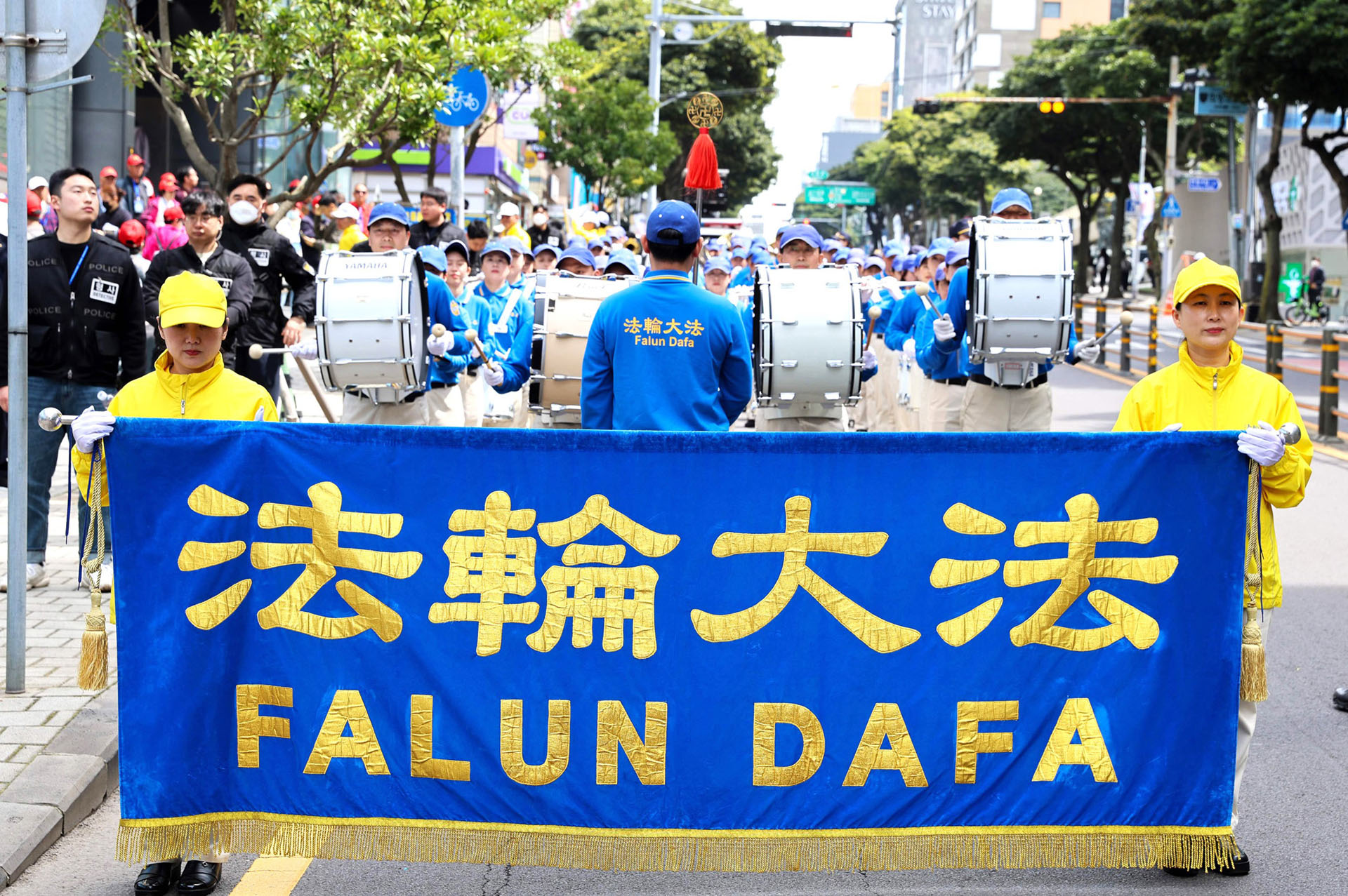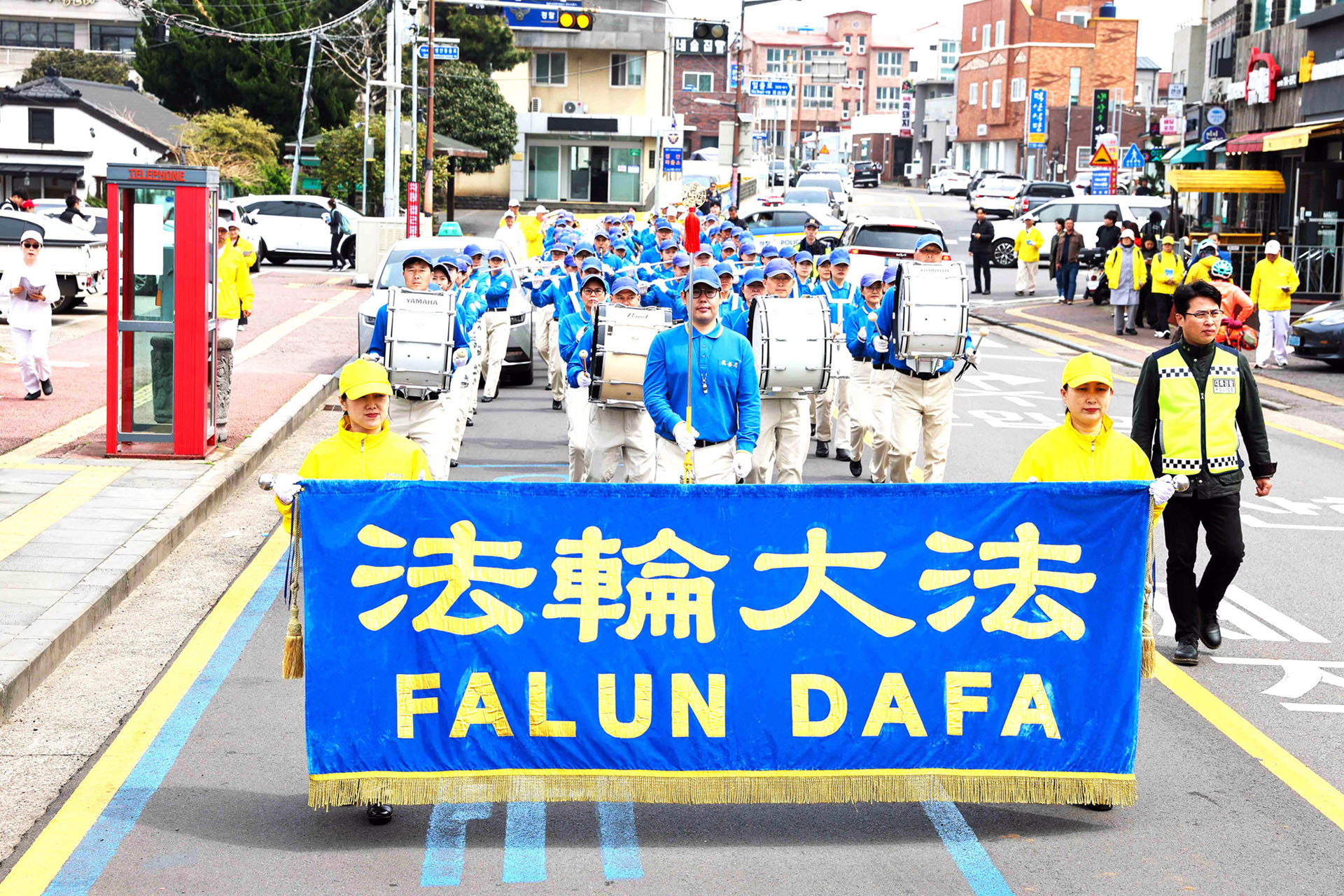 三月三十日上午,法轮功的游行以济州岛市中心的三多公园为起点,历时两个小时,途径新罗免税店、乐天免税店、步行街。游行途中,由法轮功学员组成的天国乐团演奏了多首原创曲目,包括《法轮大法好》、《法鼓法号震十方》、《凯旋》、《送宝》等气势磅礴的军乐。他们朝气澎湃、气宇轩昂,呈现出修炼人的独特风貌,将真、善、忍的美好带给了济州的市民和游客,人们欢欣鼓舞地感受着法轮大法带来的希望和纯正的能量。