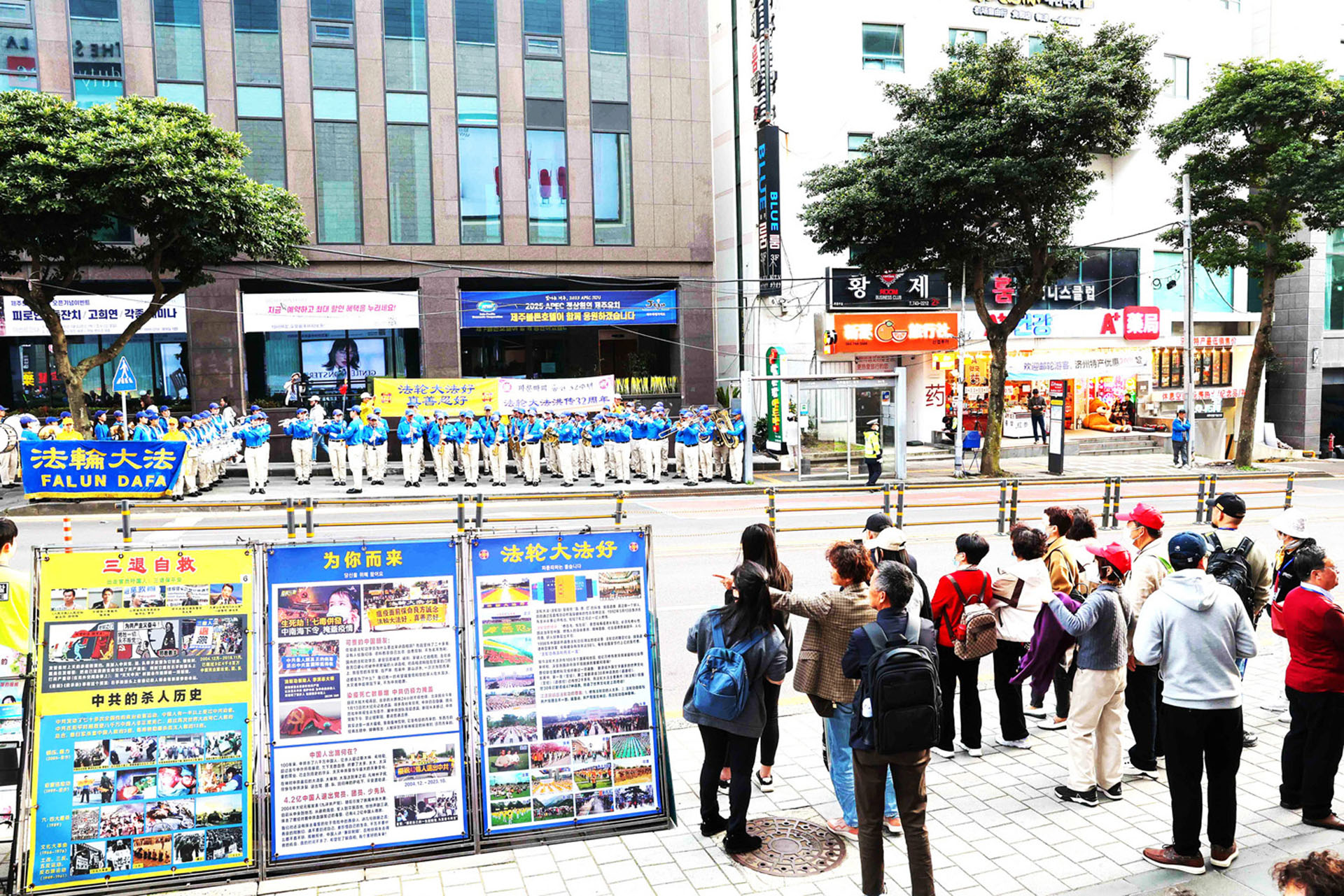 济州岛是韩国最大的岛,民俗风情朴实,常年气候温和,有韩国夏威夷之称,是国际一流的旅游胜地之一。近来中国公民可以办理免签去济州的手续,因此中国游客格外多。那两天在济州岛这个古老的“神话之岛”上,法轮功壮观的游行队伍,以及由法轮功学员组成的天国乐团的表演,受到了当地人们的欢迎与游客的喜爱。有的中国游客竖起大拇指,表示真了不起。有位女士当场高喊:“法轮大法好!真善忍好!”“中国人民感谢你们!”