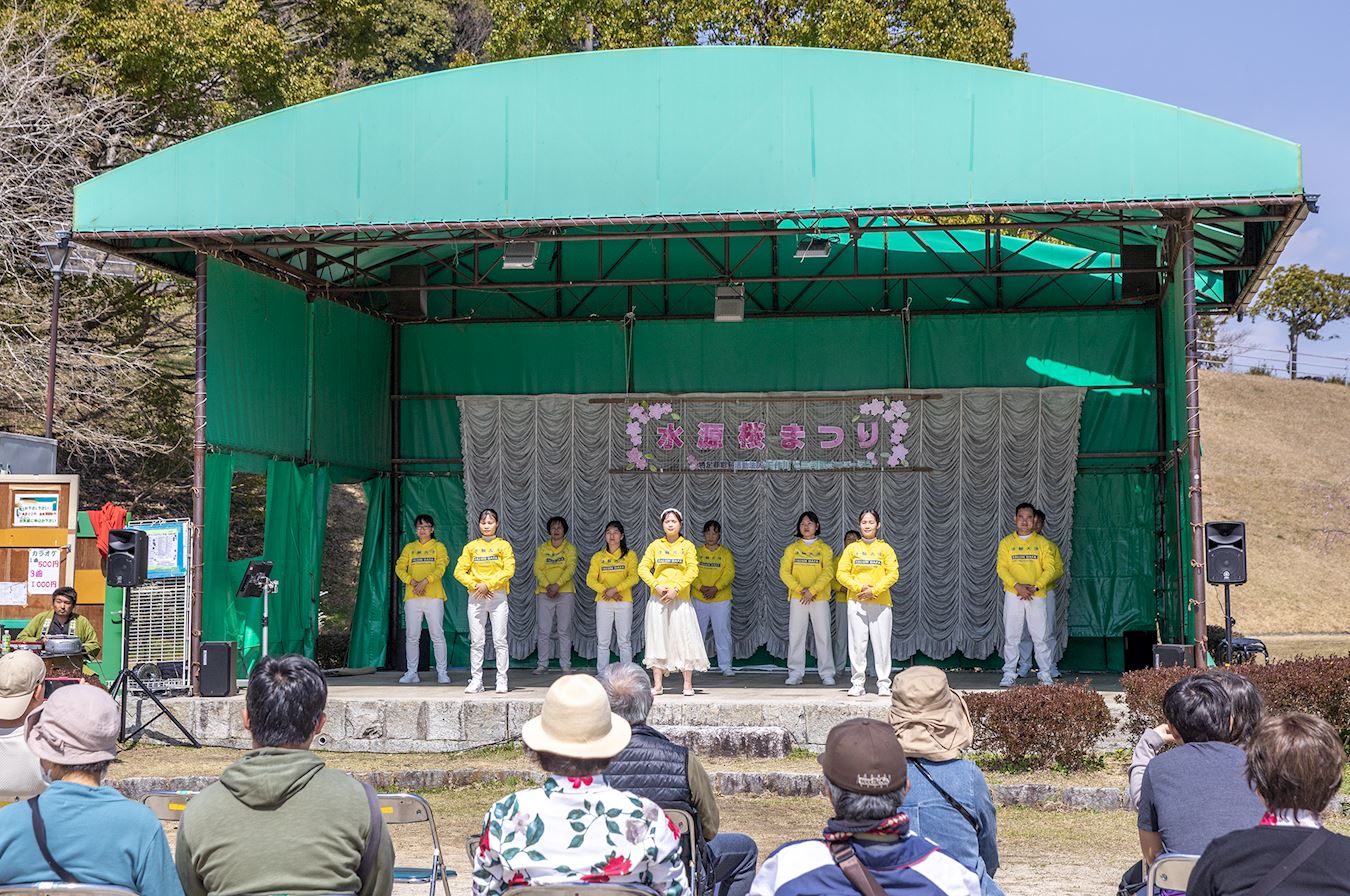 法轮功在舞台上表演《法轮大法好》、《喜庆》与《三退》等曲目的腰鼓;已经八十岁的法轮功学员水野女士(Ms.Mizuno)表演了小提琴独奏,她自己作曲的《大浪淘沙》曲目;法轮功学员们还在舞台上演示了法轮功的五套功法。