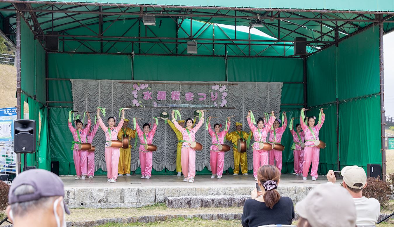 ![]() 图8~9:在丰田市水源公园樱花节的舞台上,法轮功学员们在表演腰鼓。 |