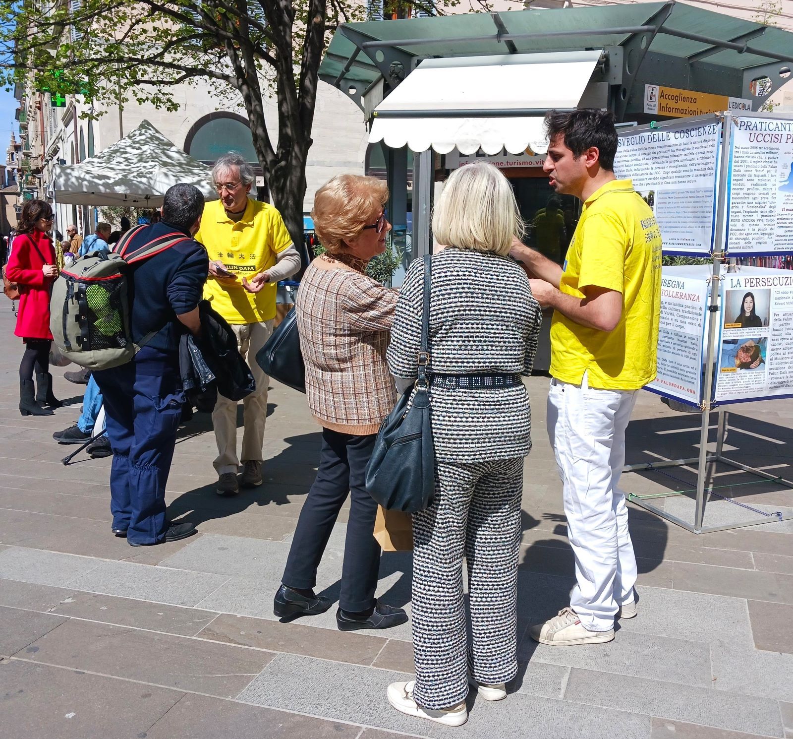 一名不会说意大利语但在安科纳大学学习的伊朗年轻人,走近真相摊位并用英语与学员交谈,他告诉学员他是在互联网上了解到法轮大法的。他很惊讶地在安科纳也见到了学员,他在学员的展位附近停留了很长时间才离开。