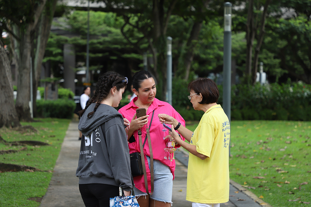 二十六岁的劳拉(Laura)来自澳洲,正在东南亚旅行。她说,炼功场景给她传递了正面的讯息,让她觉得法轮功很好,真善忍很好。学员向她介绍五套功法,鼓励她学炼,还告诉她在澳洲也能找到法轮功。