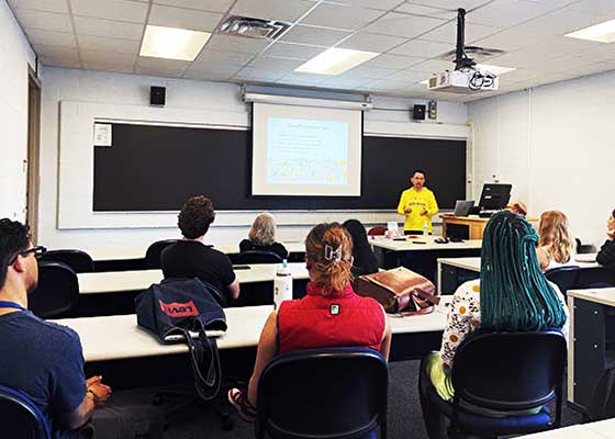法轮功学员4月15日应邀参加了费城拉萨尔大学举办的全球语言和文化意识周活动,向师生们介绍了法轮功并当场教功,受到欢迎。