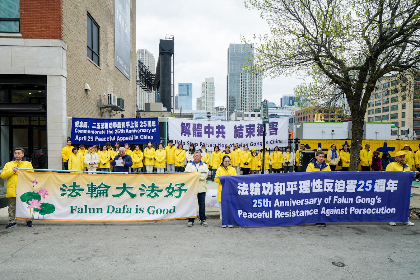 ![]() 图5:法轮功学员林先生(前排中手持横幅)在芝加哥中领馆前参加集会,纪念法轮功学员“四·二五”和平上访二十五周年。 |