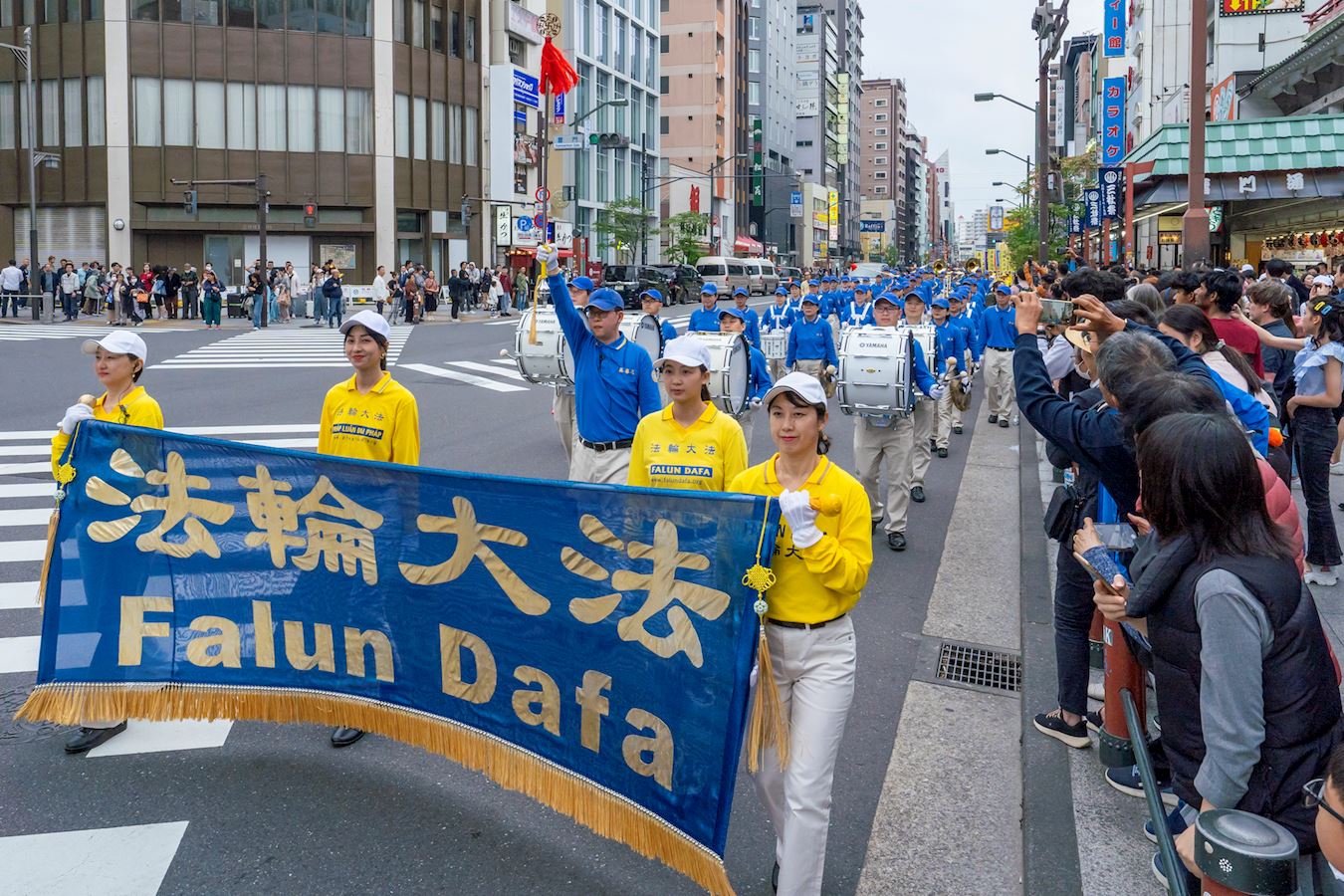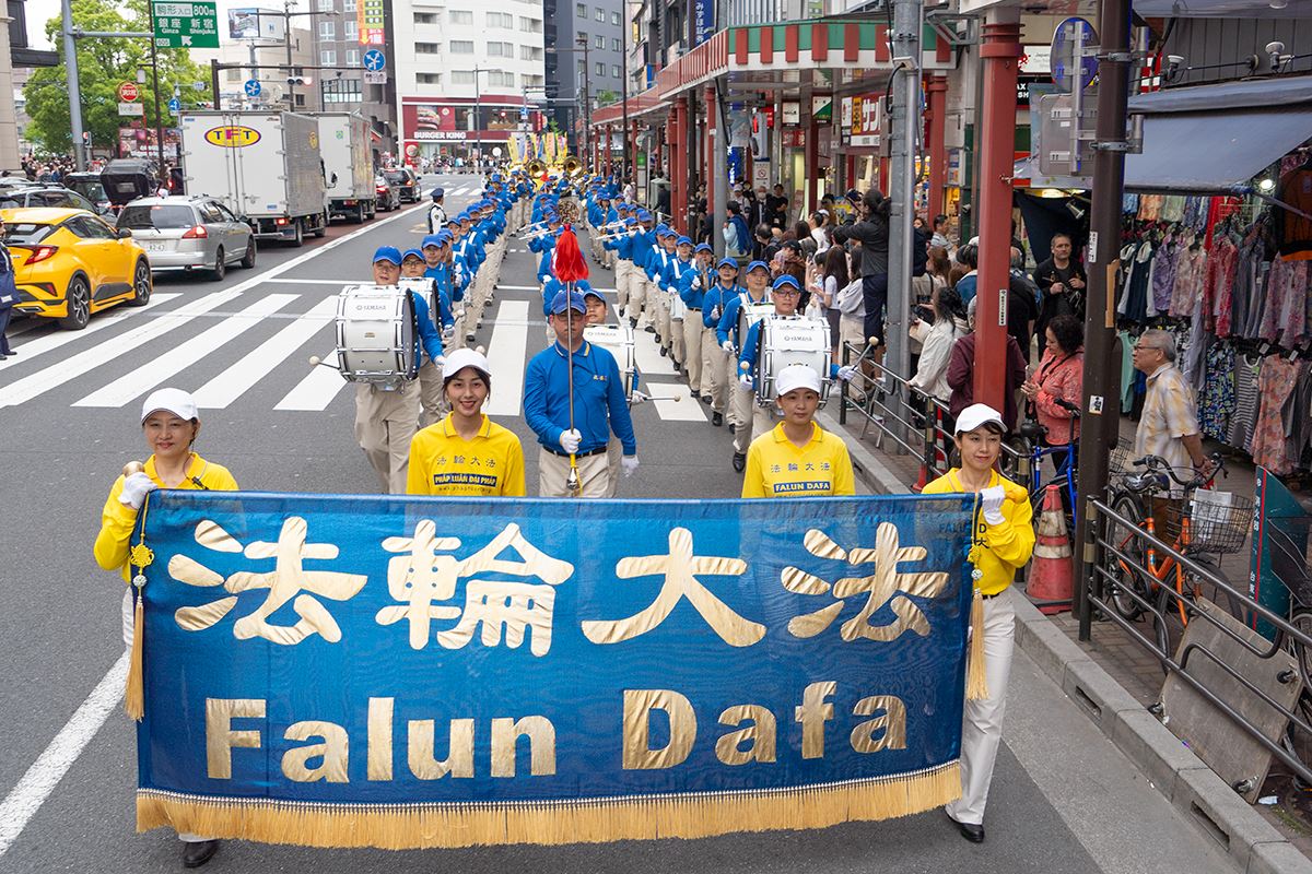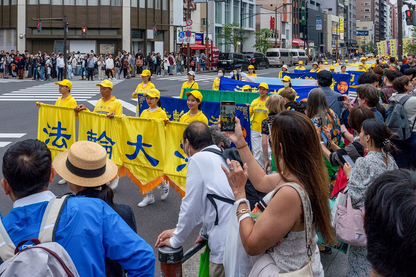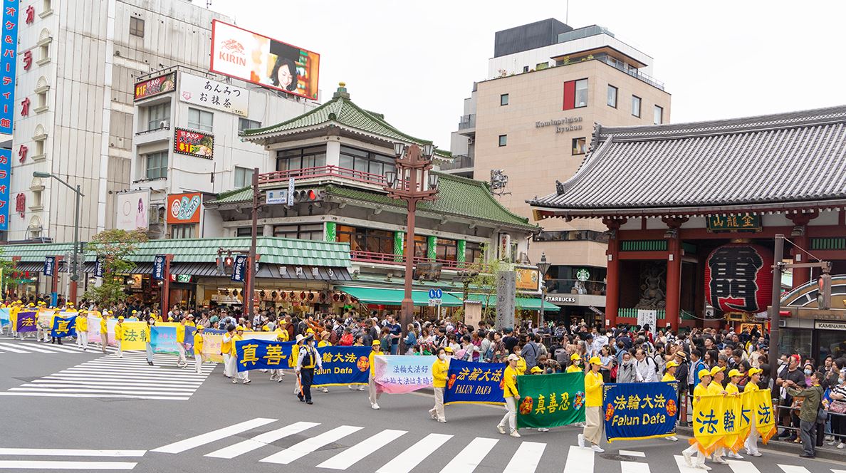 今年四月二十一日下午三点半,日本法轮功学员浩浩荡荡的游行队伍在天国乐团的带领下,从花川戸公园出发,途径浅草、雷门、隅田川等观光胜地,吸引了大量民众驻足观看。