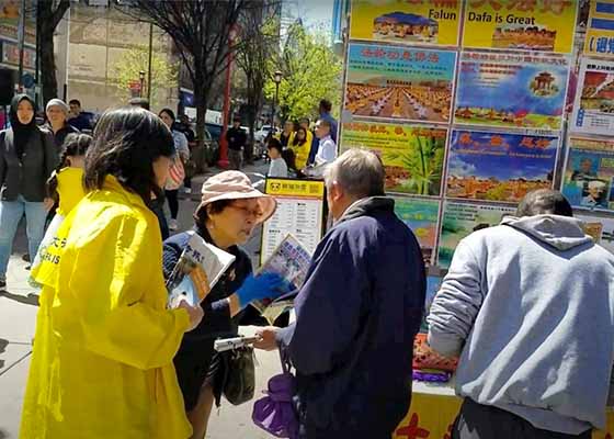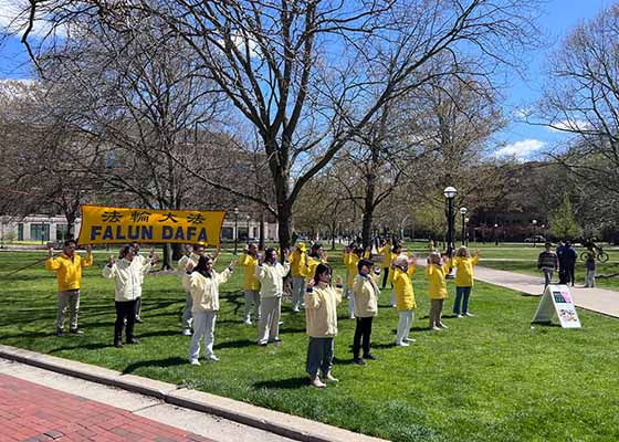 四月二十一日,密西根大学安娜堡分校的校园中心,成为了密西根州法轮功学员们举行集体炼功、展示功法、讲真相的聚集之地。