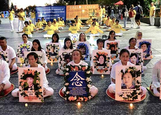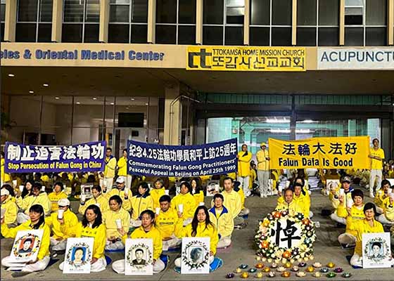 今年是上万名法轮功学员“四·二五”和平上访二十五周年。四月二十一日晚,夜幕降临,美国洛杉矶法轮功学员在中共领馆前举行烛光夜悼,纪念二十五年来至少数以千计的被中共迫害致死的同门同修。