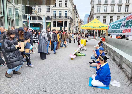 二零二四年四月二十日,比利时法轮功学员在布鲁塞尔的商业大街旁举行纪念“四·二五”活动。