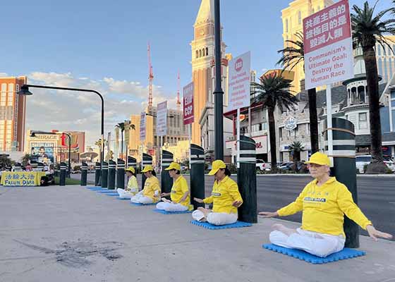二零二四年四月二十日,美国拉斯维加斯法轮功学员在赌城市中心最繁华的赌场大道上举行纪念“四·二五”集会活动。