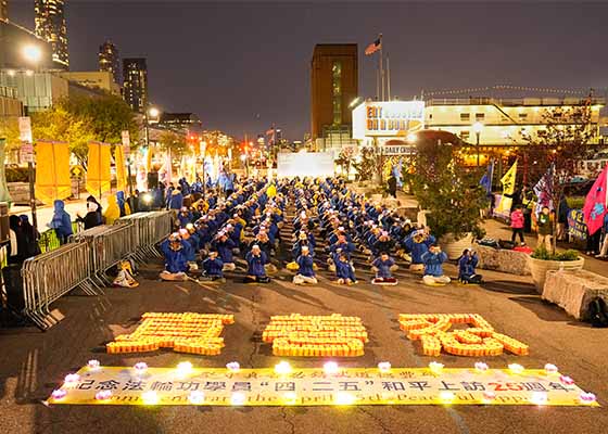 4月21日晚,在“四·二五”和平上访25周年之际,来自纽约地区的数百名法轮功学员在曼哈顿中领馆前举行烛光夜悼,纪念25年来成千上万被中共迫害致死的同门弟子。