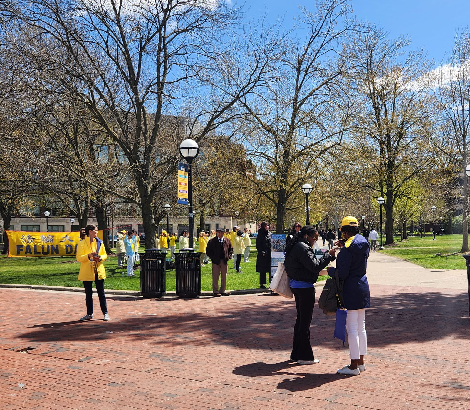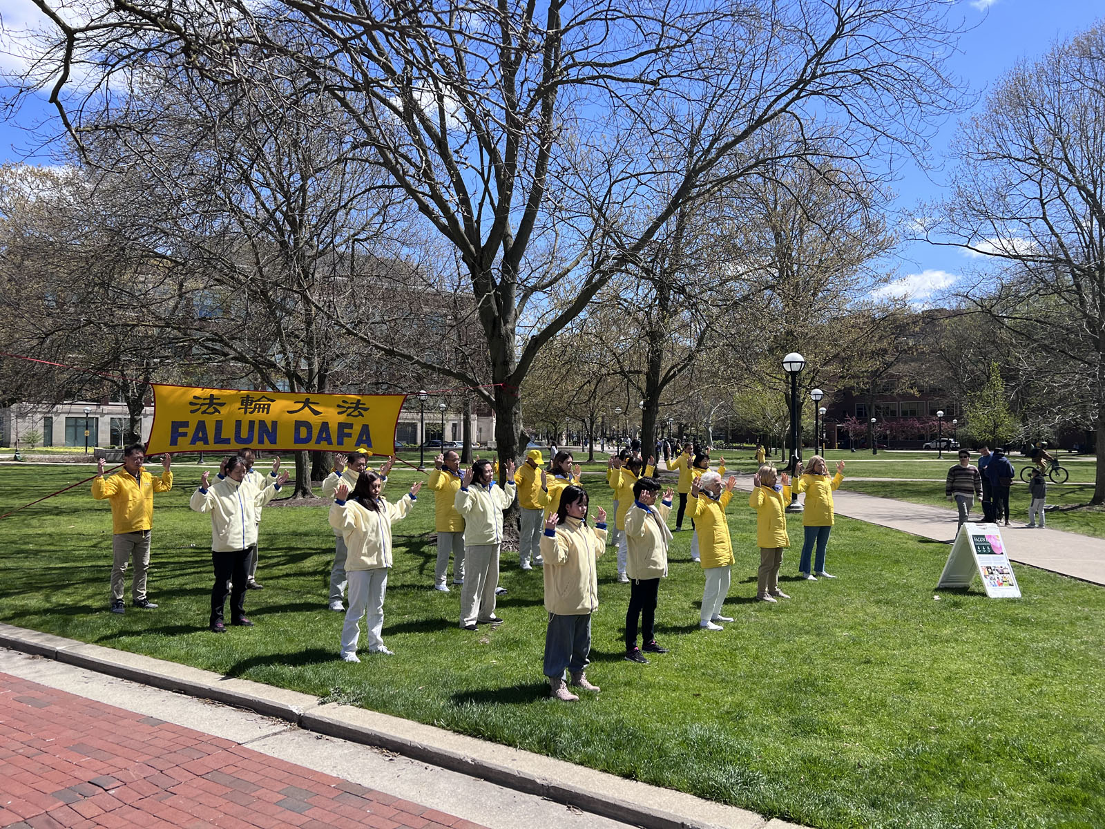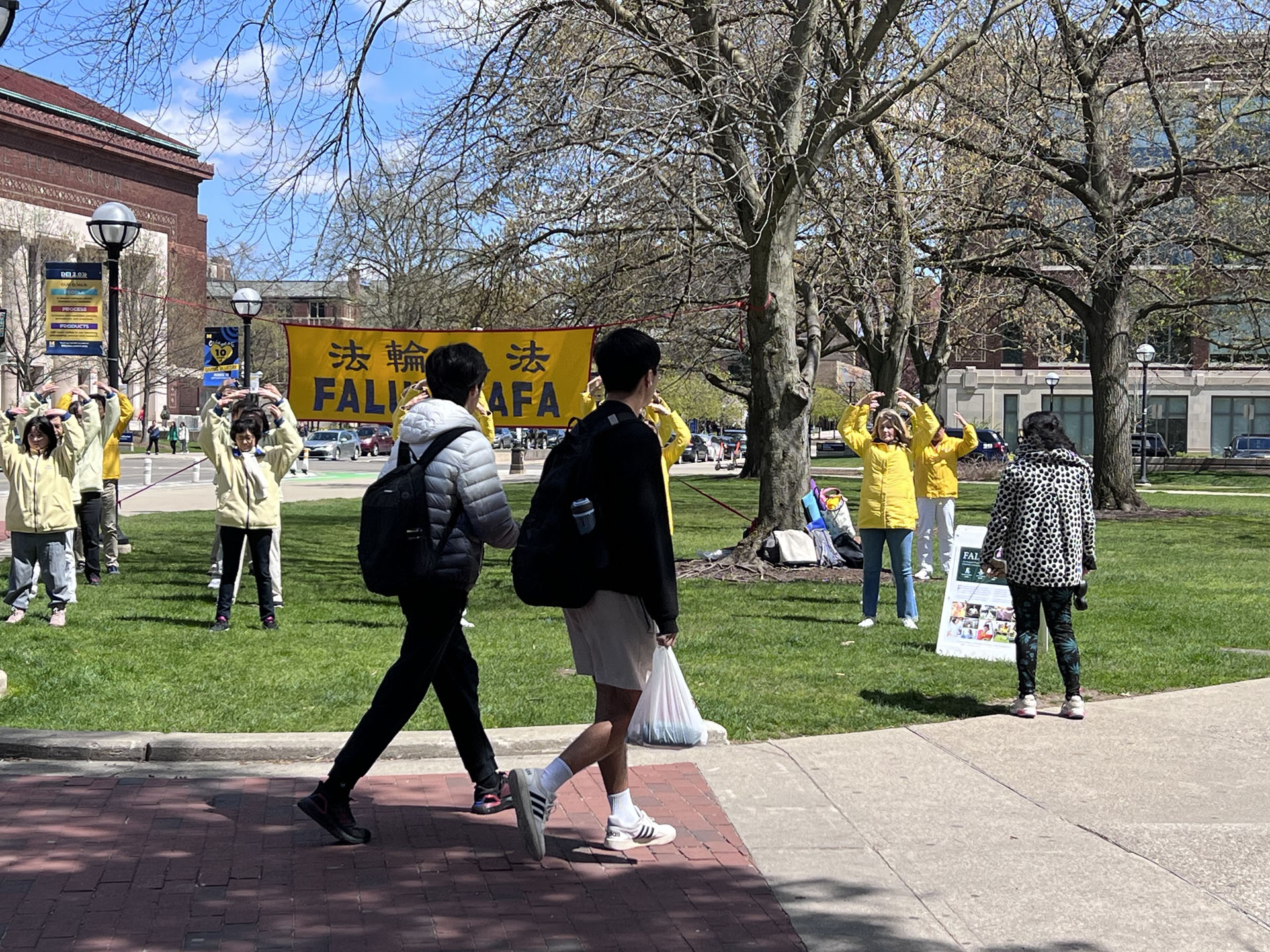 由于近学期末,又是一年一度的毕业季临近,这座历史悠久的世界综合性研究型大学校园内,人群川流不息。活动当天,阳光明媚,地处美国中北部的密西根州仍是春寒料峭的时节,但依然挡不住师生和来准备参加毕业典礼的各地民众穿梭在校园内。法轮功学员展示的舒缓祥和的功法,自然而然地吸引了很多师生驻足。