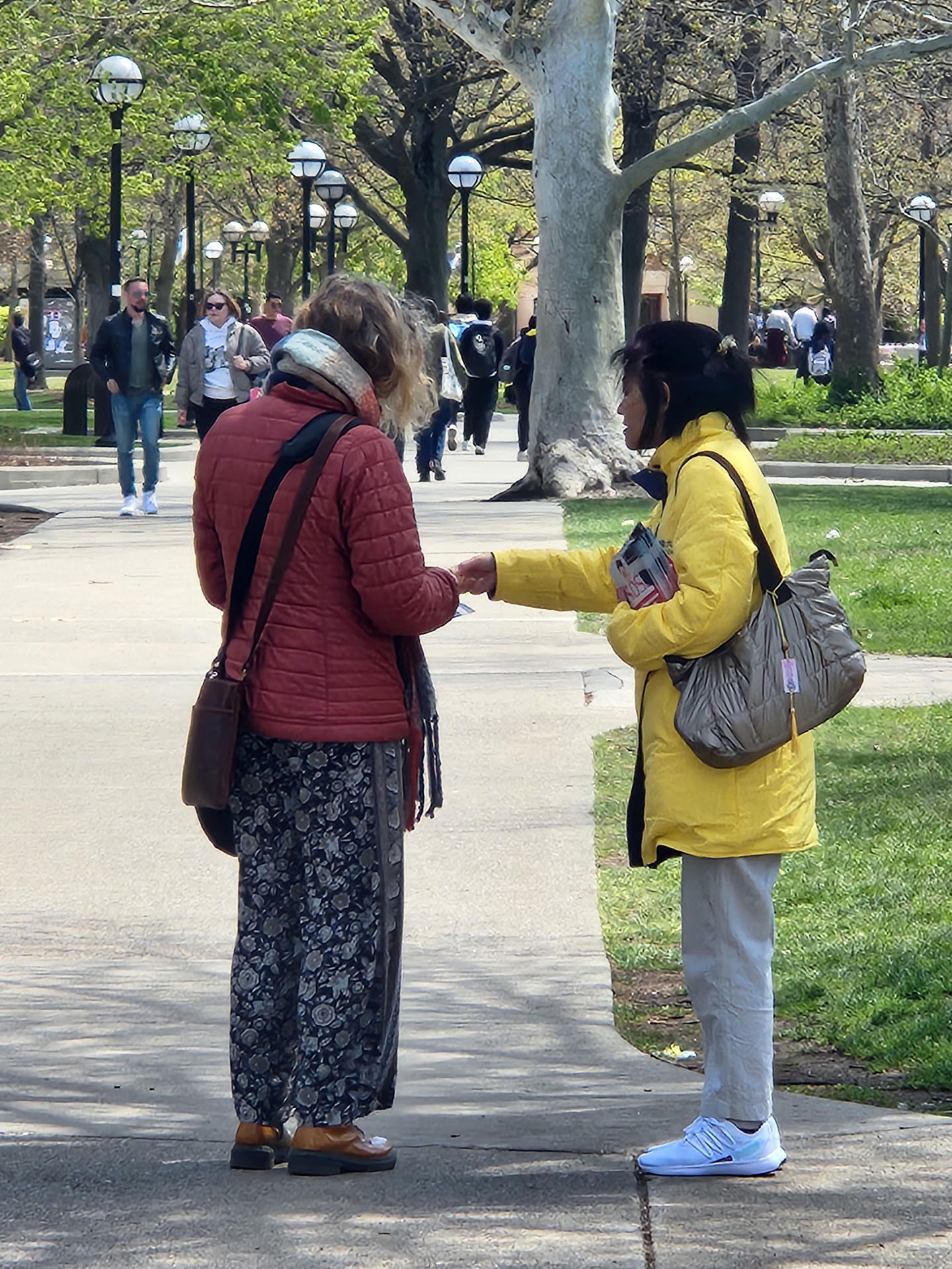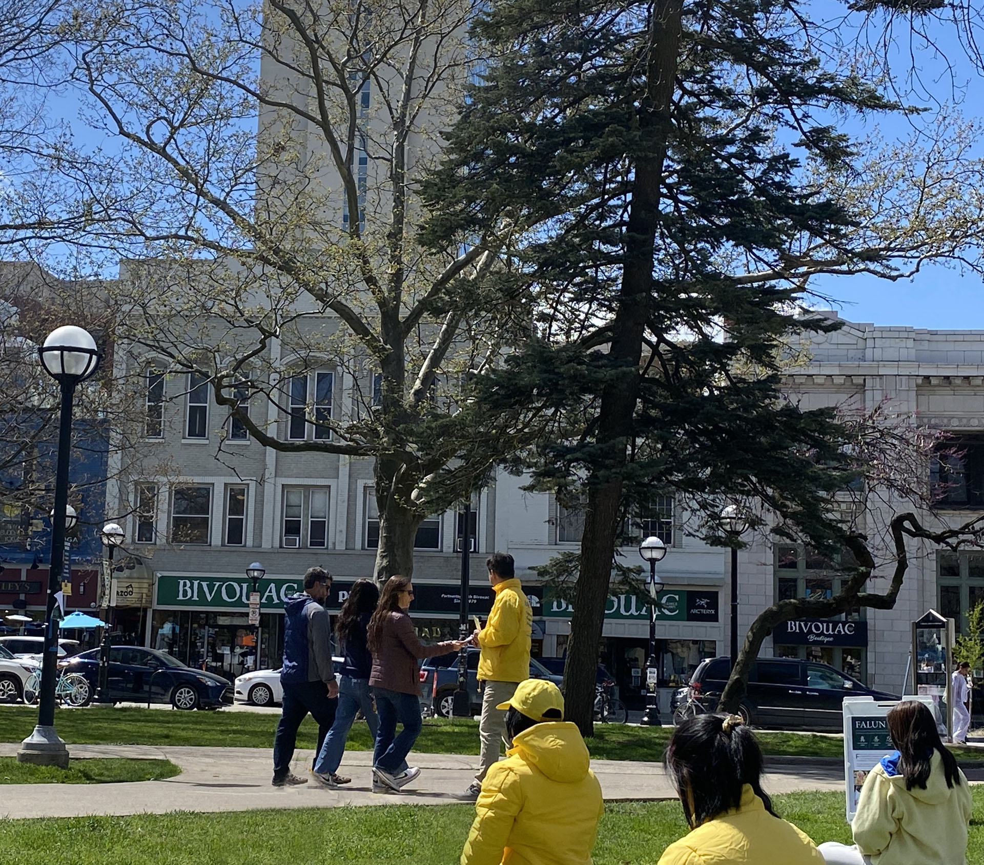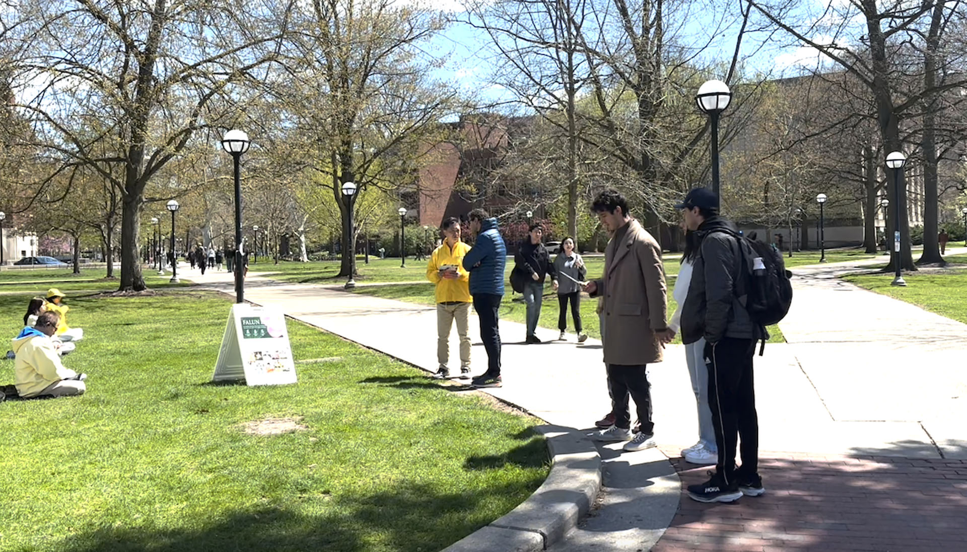 由于近学期末,又是一年一度的毕业季临近,这座历史悠久的世界综合性研究型大学校园内,人群川流不息。活动当天,阳光明媚,地处美国中北部的密西根州仍是春寒料峭的时节,但依然挡不住师生和来准备参加毕业典礼的各地民众穿梭在校园内。法轮功学员展示的舒缓祥和的功法,自然而然地吸引了很多师生驻足。