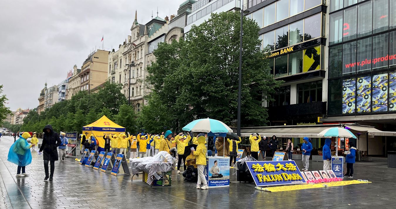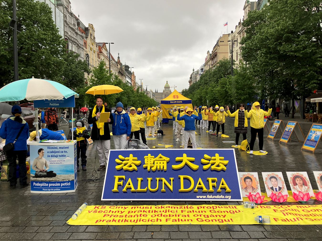四月二十日上午,法轮功学员来到繁华的瓦茨拉夫广场,这里是许多居民和外国游客经常光顾的景点,位于捷克首都布拉格市中心。学员们演示法轮功的功法、展出法轮大法真相展板,并设立呼吁停止迫害的征签信息台。