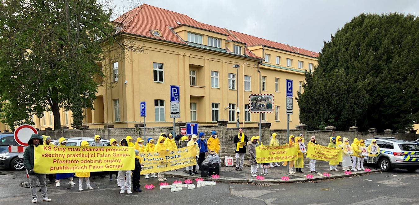 '图5~6:法轮功学员在布拉格的中共驻捷克大使馆前,呼吁停止迫害法轮功。'