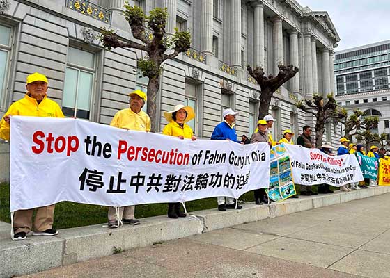 四月二十三日,旧金山湾区部分法轮功学员在旧金山市政厅前举办真相图片展,纪念“四·二五”法轮功和平上访二十五周年。
