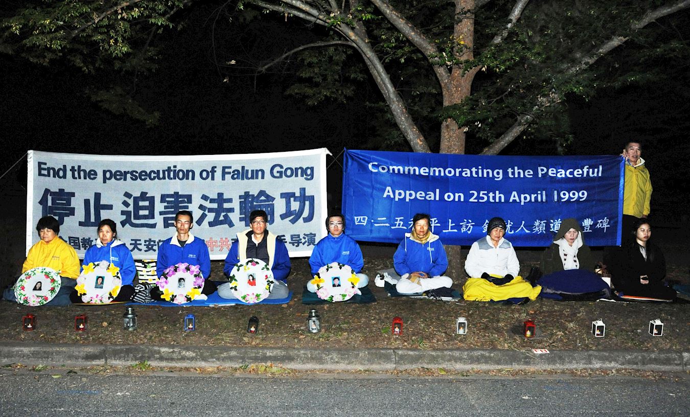 '图1~2:二零二四年四月二十四日傍晚,堪培拉法轮功学员在中使馆前烛光夜悼。'