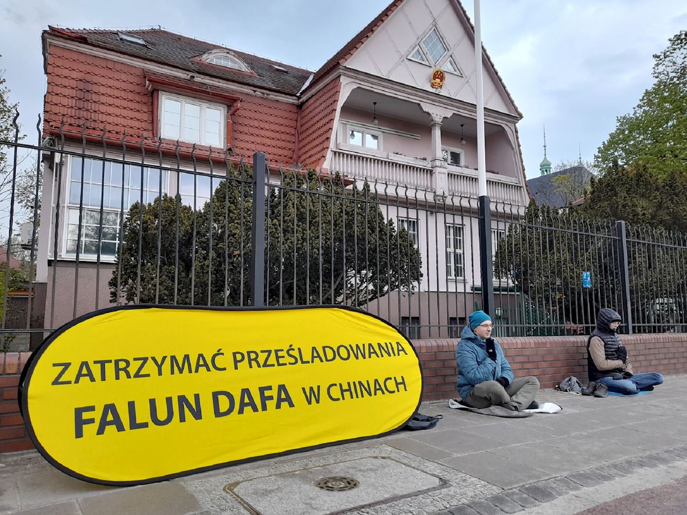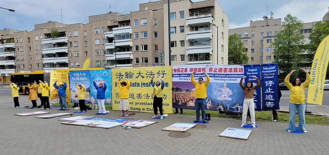 今天是“四·二五”万名法轮功学员和平上访二十五周年纪念,学员身边的波兰语条幅表达着二十五年来从未中断的正义呼声“制止中共对法轮功的迫害”。
