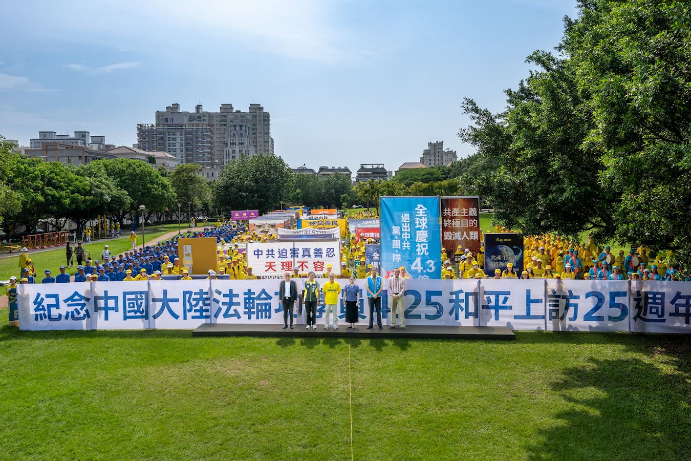 图1~2:二零二四年四月二十七日下午,约千名来自中台湾的法轮功学员于台中市惠来公园举办纪念四·二五和平上访二十五周年的集会及遊行,与会贵宾参与记者会。