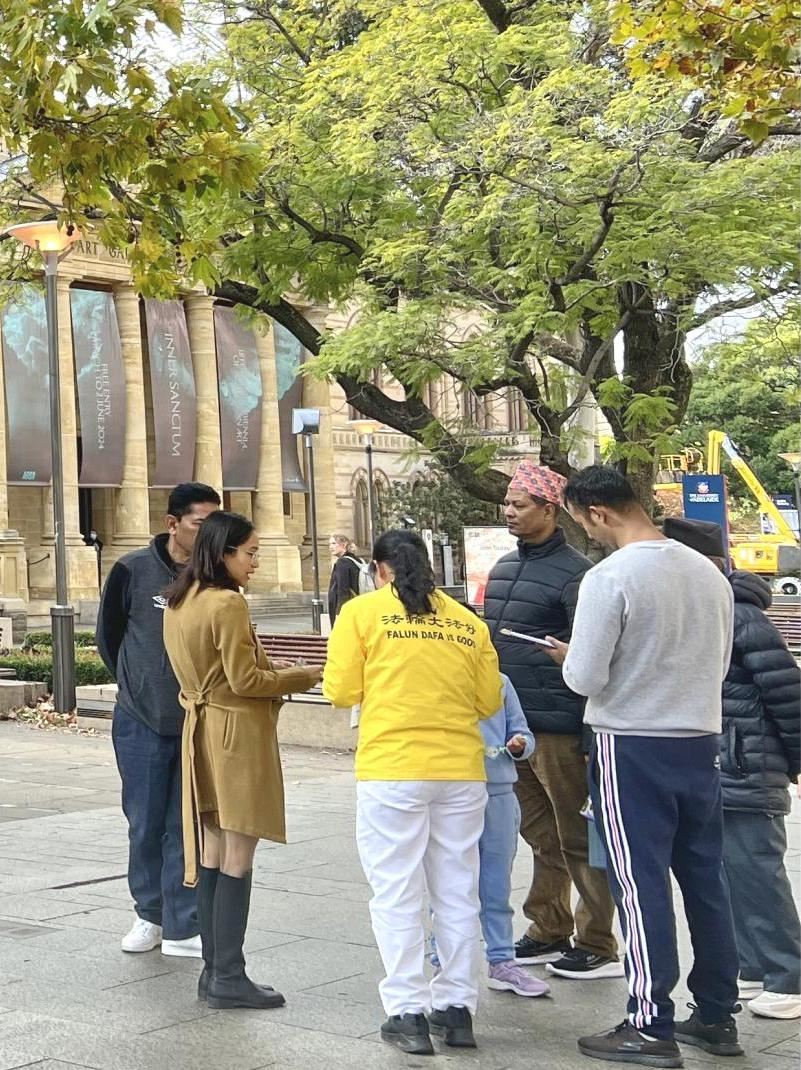 澳洲女青年米娅(Mia)和朋友们路过时被优美的音乐和祥和的炼功场面吸引,跟着学起了动作,米娅说:“非常祥和、宁静。”学员告诉她法轮功教导人按照真、善、忍修炼,提升自己,她感佩道:“太好了。”于是立即和朋友们都拿了资料。