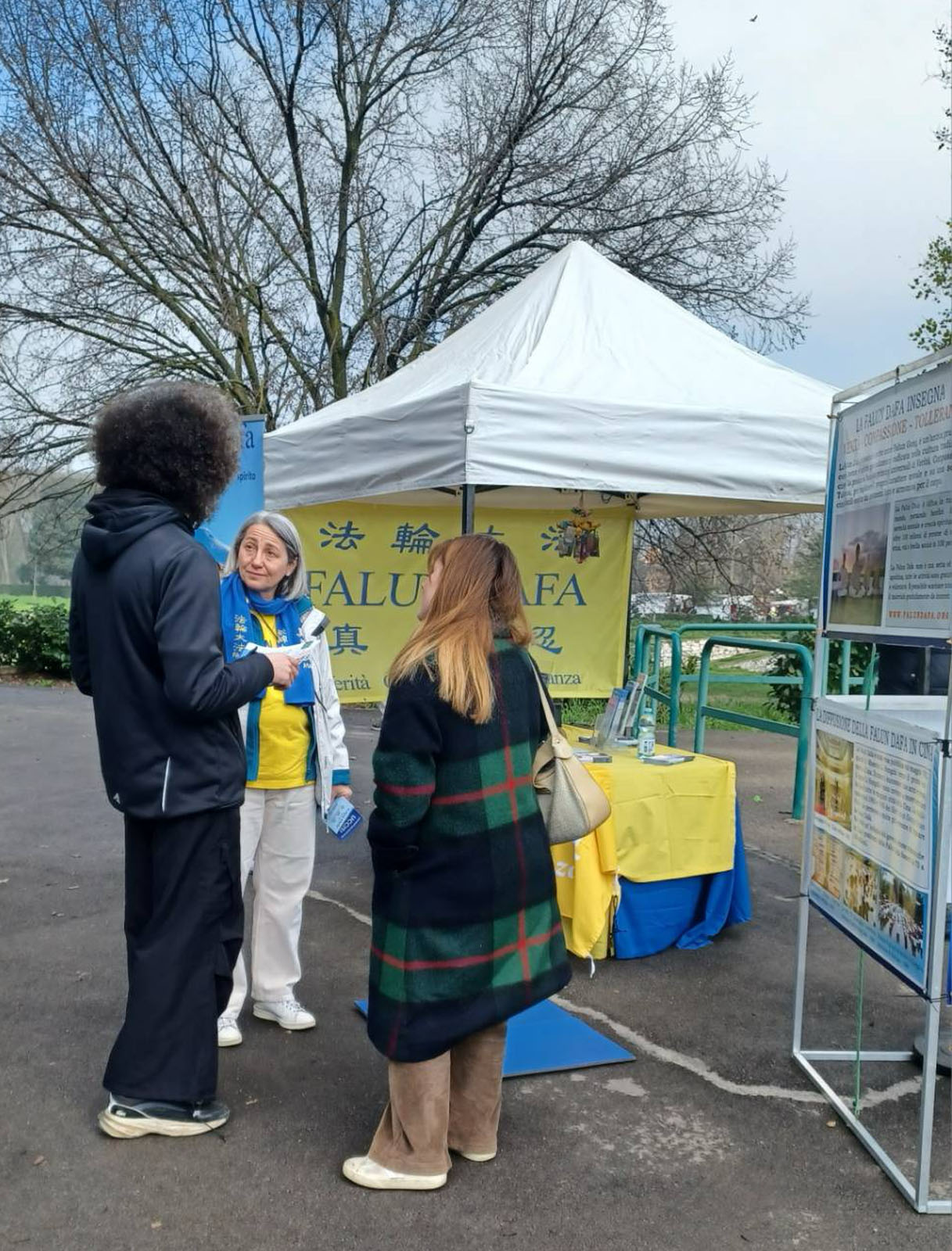 活动期间一位来自意大利北部的女士和家人一起来到真相展板前,阅读展板内容。之后她向学员详细询问了许多问题,特别是关于法轮功学员在中国遭受到的迫害。