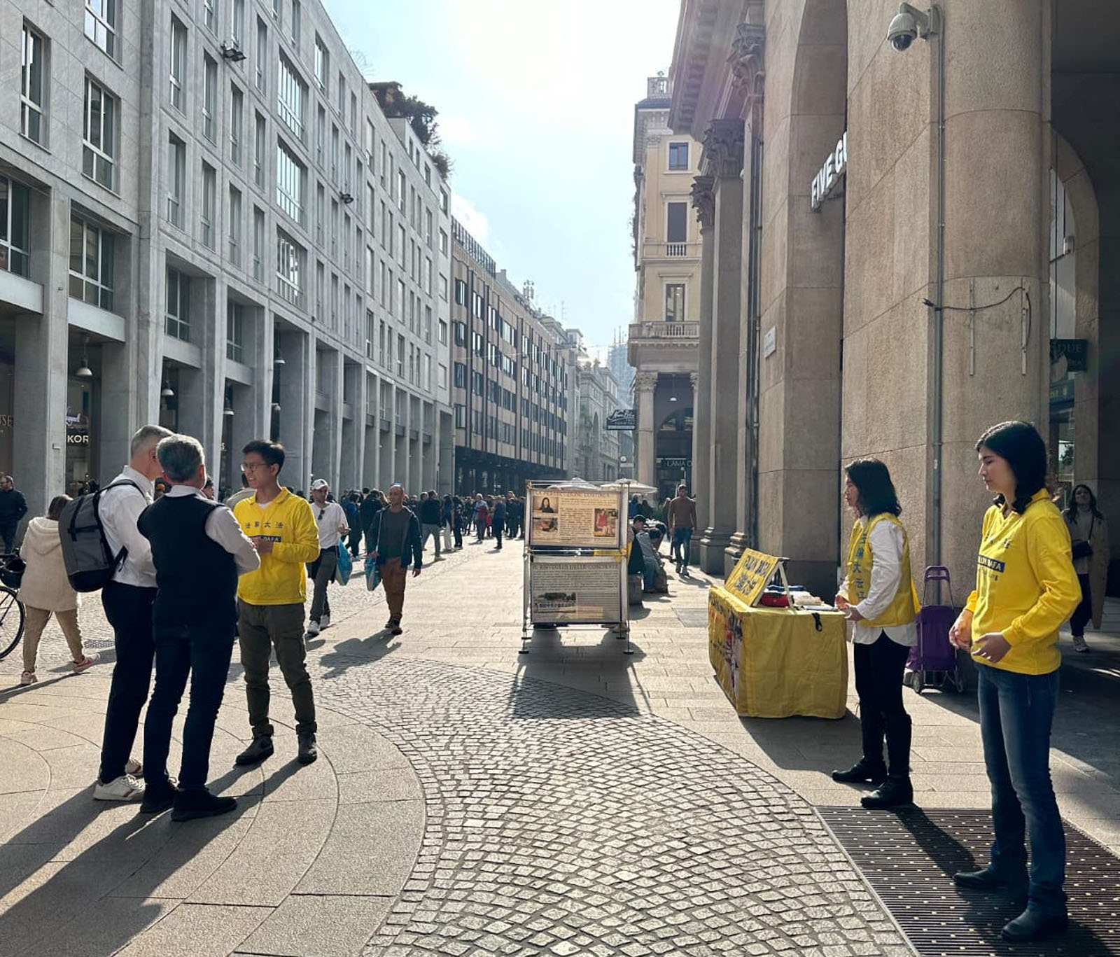 二零二四年三月二十三日星期六,米兰法轮功学员在米兰市中心,托罗画廊/维托里奥·埃马努埃莱二世广场(Galleria del Toro/Piazza Vittorio Emanuele II)开展弘法、炼功、讲真相活动。