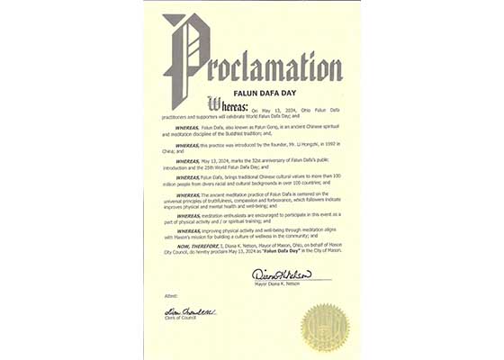 在世界法轮大法日到来之前,美国俄亥俄州梅森市市长褒奖法轮大法,宣布二零二四年五月十三日为梅森市的“法轮大法日”。