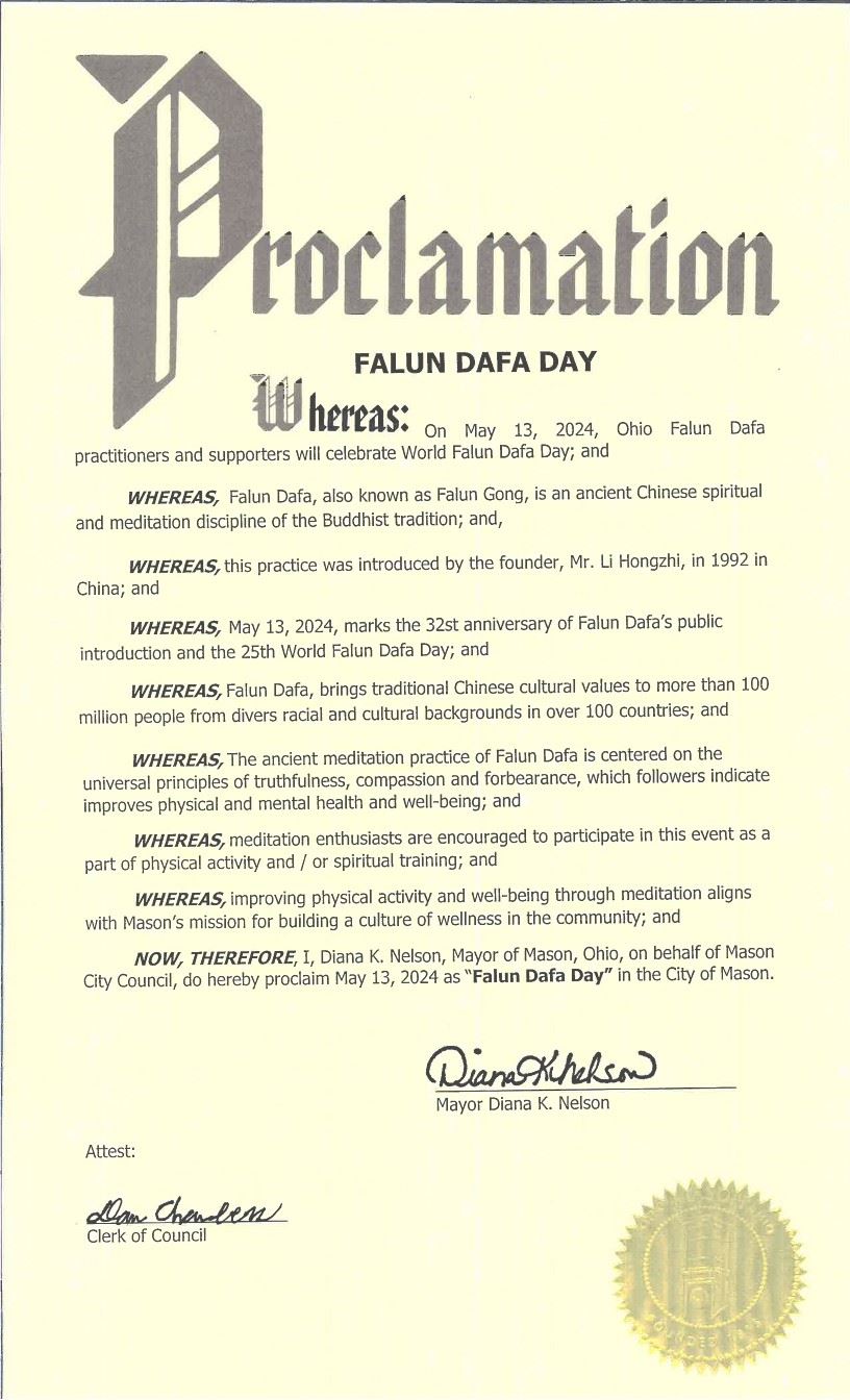 现在,因此,我,戴安娜·K·纳尔逊,俄亥俄州梅森市市长,代表梅森市政府,在此宣布二零二四年五月十三日为梅森市的“法轮大法日”。