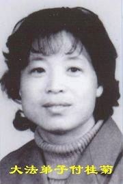 付桂菊,女,58岁,张家口市石油公司退休工人,家住张家口市明德南塞北商场旁边。二零零七年五月十二日晚,被明德南街派出所绑架。付桂菊绝食抵制迫害,在身体出现生命危险时放回。六月四日,桥西公安分局与明德南派出所警察将刚被放回家,身体还未恢复的付桂菊再次从家中强行绑架,送张家口十三里看守所继续迫害。二零零七年六月十八日,付桂菊在十三里看守所遭遇迫害性灌食时,被活活折磨致死。