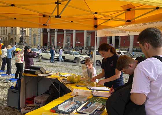 - 慕尼黑王宫广场弘法 游客谴责迫害- 德国法轮功学员三月三十日在慕尼黑王宫前的马克斯-约瑟夫广场举办活动,展示法轮功的美好,揭露中共迫害、活摘法轮功学员器官的罪恶。