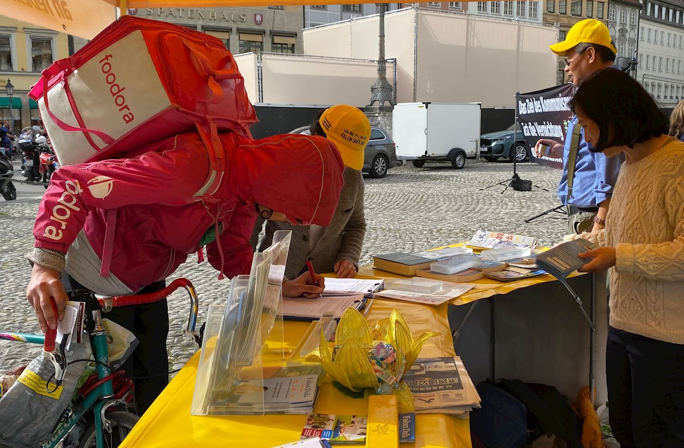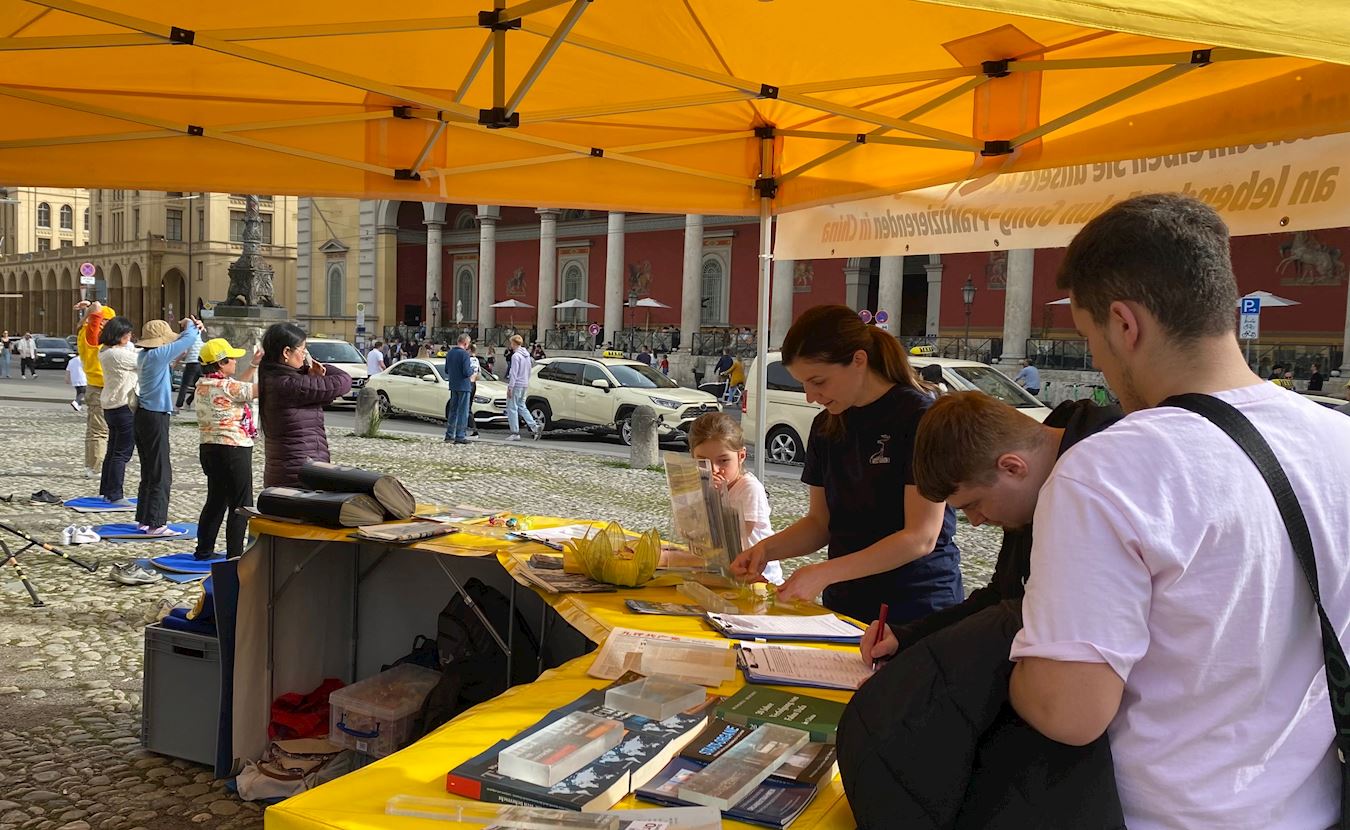 在慕尼黑王宫、国家歌剧院前的马克斯-约瑟夫广场(Max-Jeseph Platz)上,法轮功学员展开横幅:“法轮大法真善忍”、“回归传统人类才有出路”、“中共活摘法轮功学员器官”,让路过的人们一目了然。有的人停下脚步与学员交流,还有不少人签名声援法轮功学员反迫害。