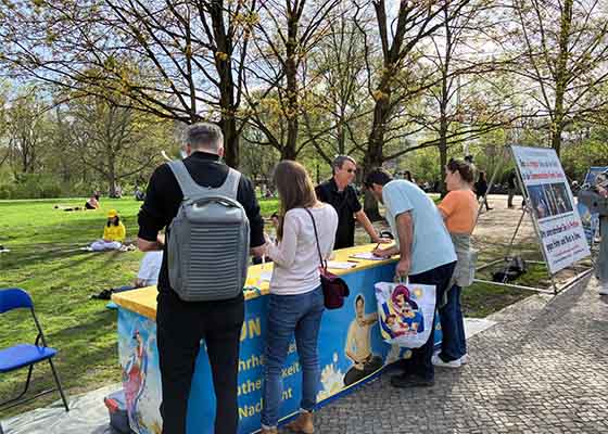 柏林部分法轮功学员继续在这个城市公园举办信息日活动,有的法轮功学员围成一圈打坐炼功,有的手持真相传单,微笑着和游客打着招呼。