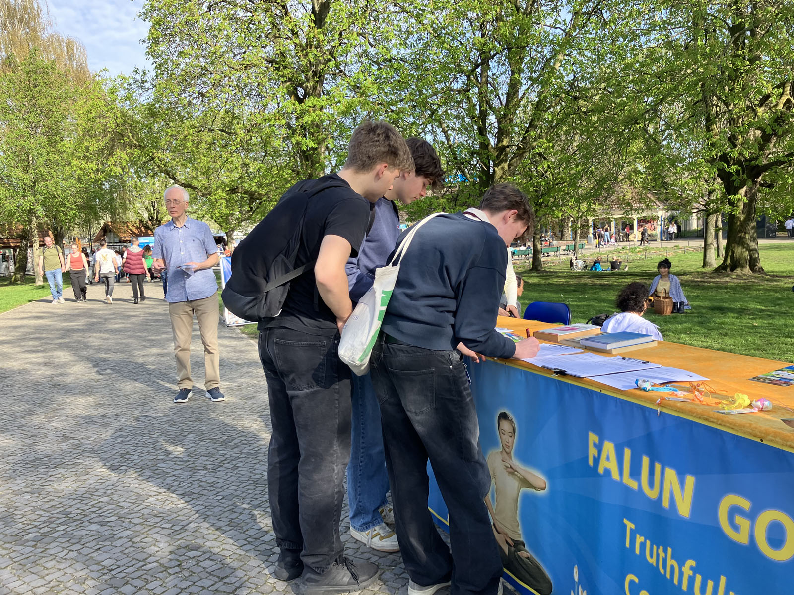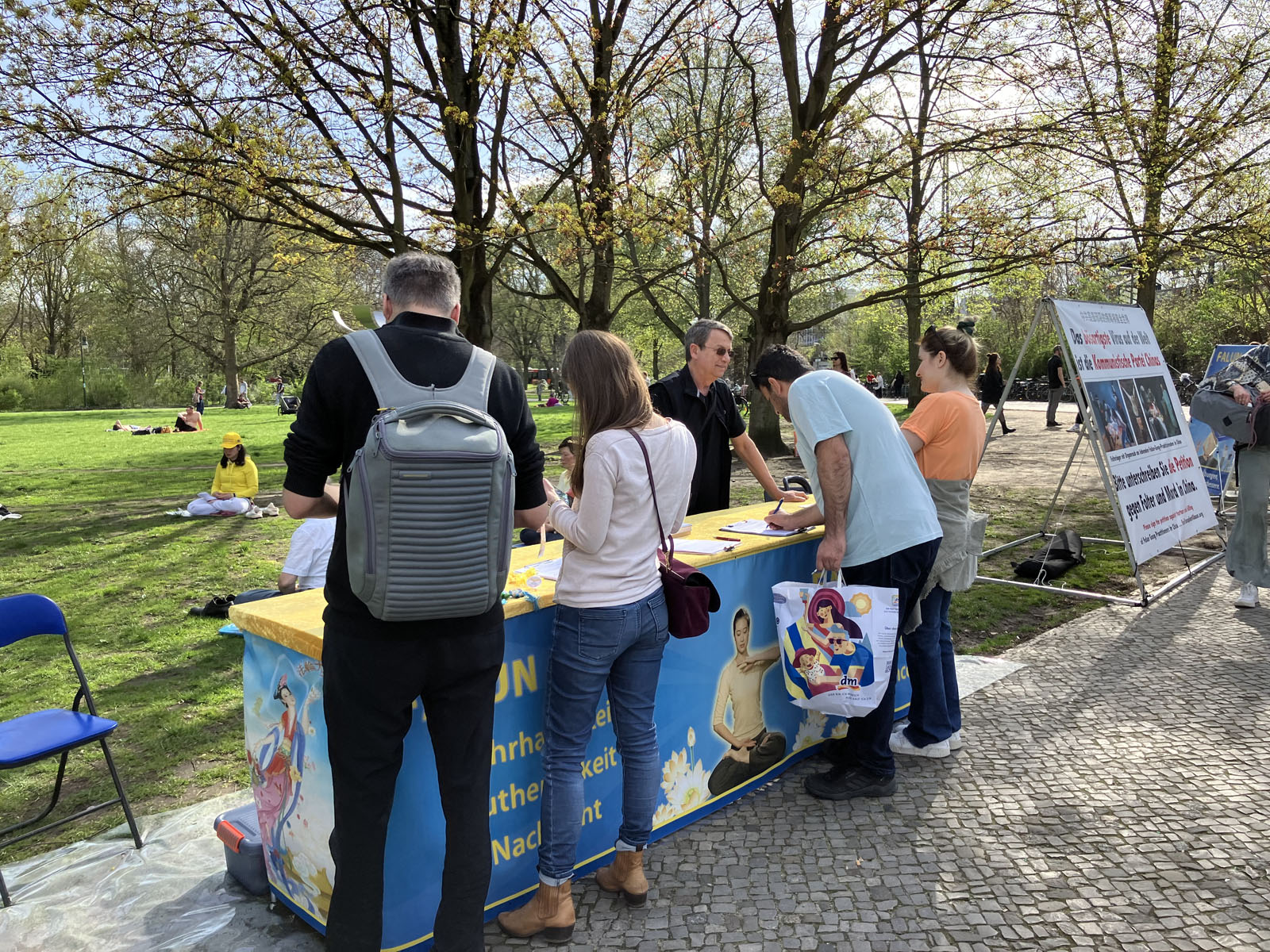【明慧网二零二四年四月八日】“在哪里可以签名支持你们?”“请问在哪里可以学炼法轮功?“这都是三五成群的柏林市民进入东柏林特雷普托公园(Treptower Park)时,向法轮功学员们提出的问题。