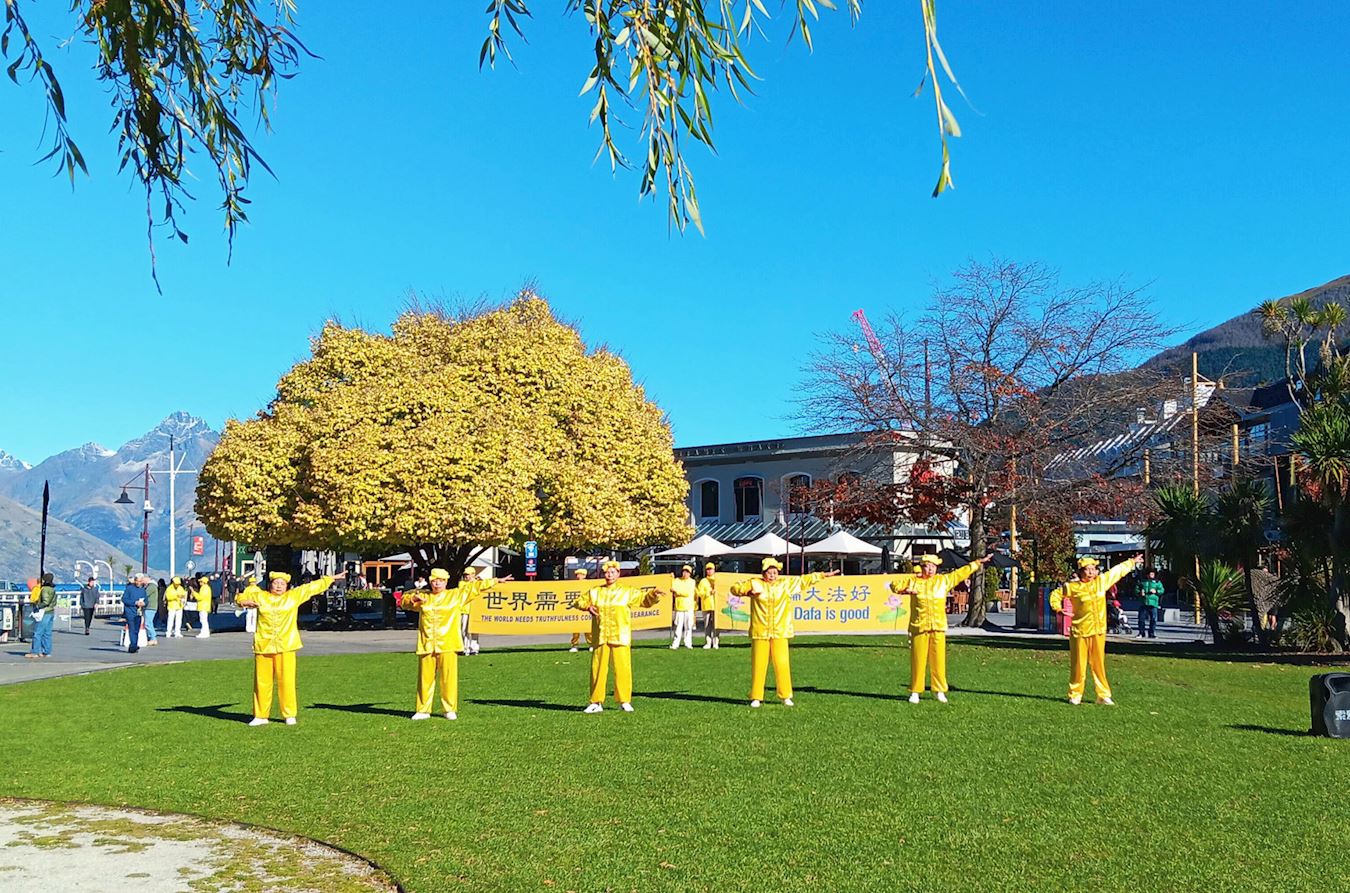 皇后镇位于新西兰南岛西南部,整个城市被非常壮观的群山环绕,远峰覆着白雪,湖水碧蓝悠远,景色变化万千,宛如仙境,成为了全新西兰乃至世界闻名的旅游度假胜地。活动当天,游人如织,来自世界各地的人们观看了由法轮功学员组成的天国乐团和腰鼓队的表演,了解了法轮大法的美好。