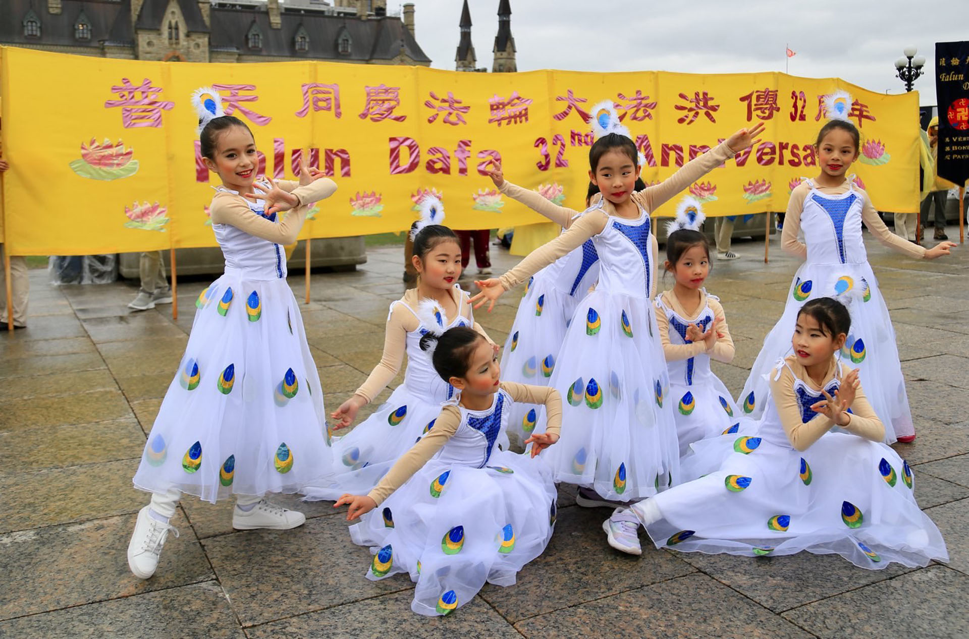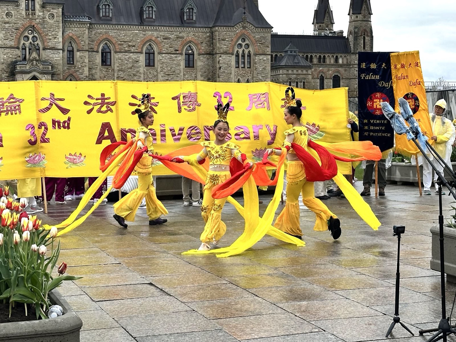 活动期间,雨过天晴。今年是法轮大法传世第三十二周年,学员们通过集体炼功、拉起真相横幅、文艺表演以及游行等方式,向世人展现大法的美好。多名来自联邦和省级的议员们也加入到庆典活动中来,并发表演讲,表彰大法和学员为加拿大所做的贡献,以及呼吁停止中共对法轮功学员的迫害