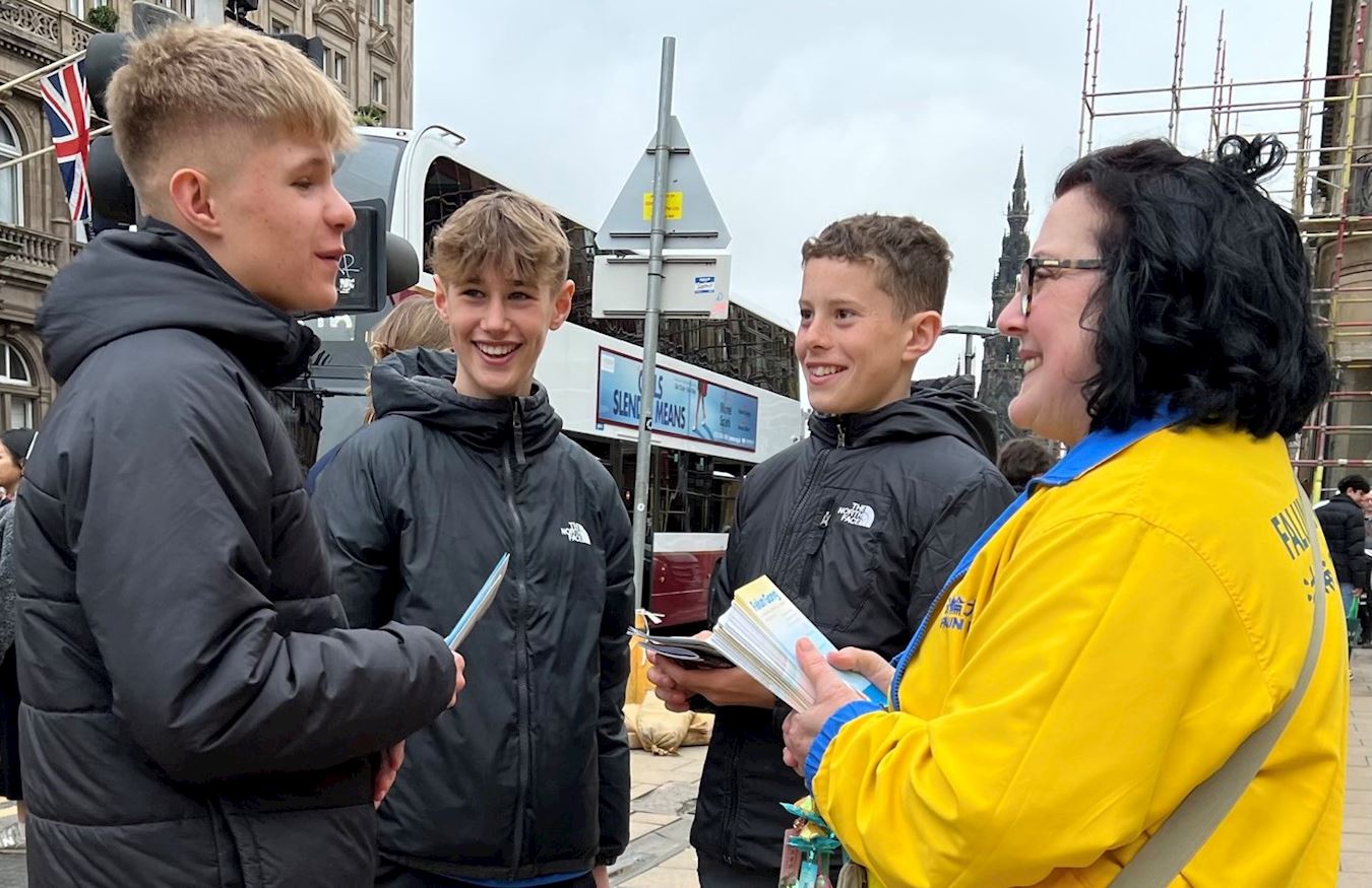 一个住在爱丁堡的男士径直走向学员,告诉学员他了解法轮功的真相,今天是来要学炼功法的。他说:“真、善、忍三个字,对一个生命来说太重要了。”得到当地免费教功班负责人的联系方式后,他开心地和学员留影。