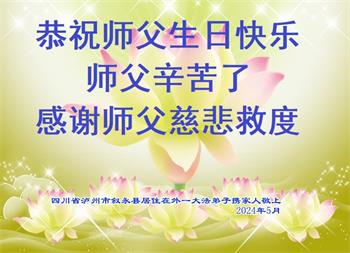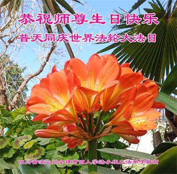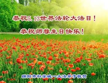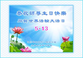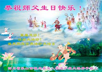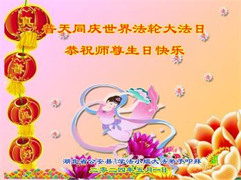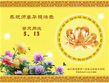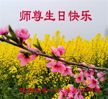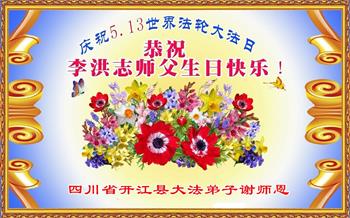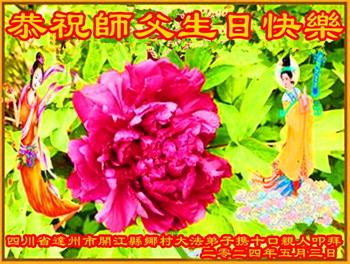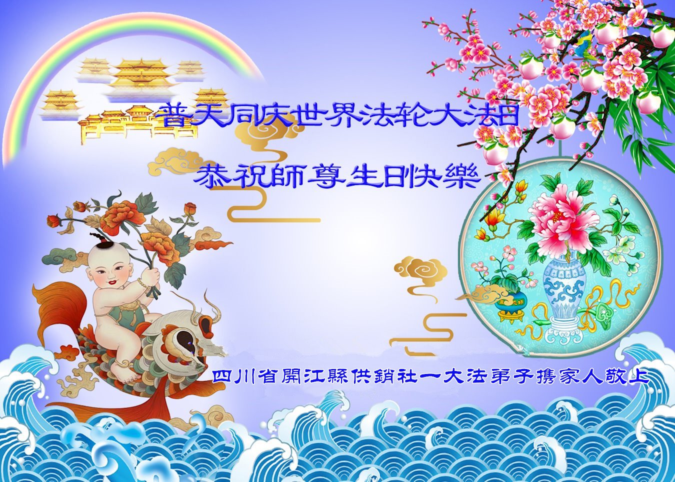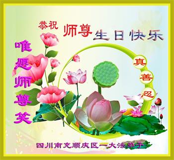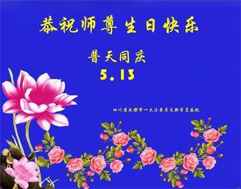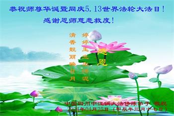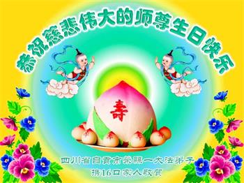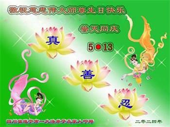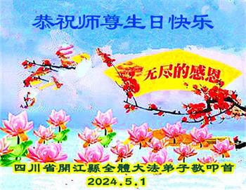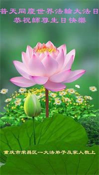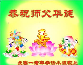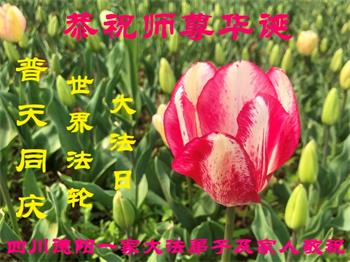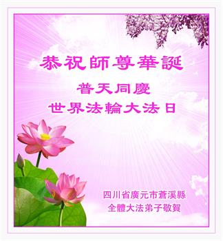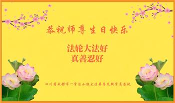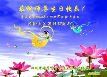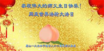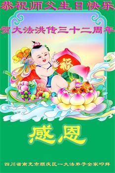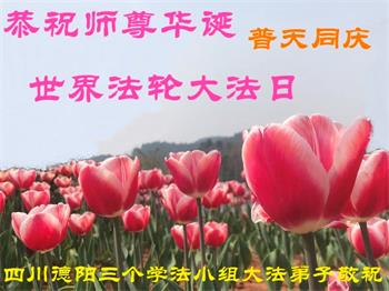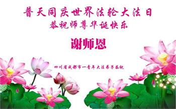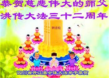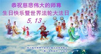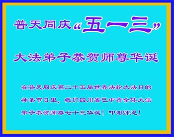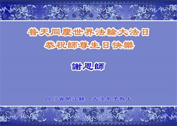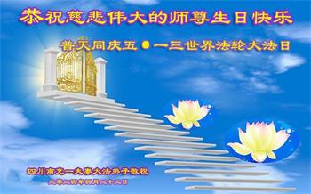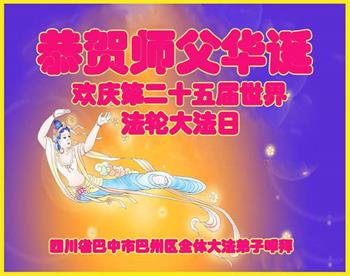 在您七十三华诞到来之际,在您传宇宙大法三十二周年之时,在第二十五届世界法轮大法日来临的时候,我们四川省巴中市农林系统全体大法弟子以万分崇敬和喜悦的心情,虔诚的跪拜在您的法像前,恭祝师父生日快乐!庆贺伟大的世界法轮大法日,感恩师父的慈悲苦度!