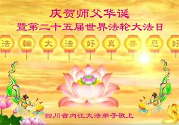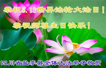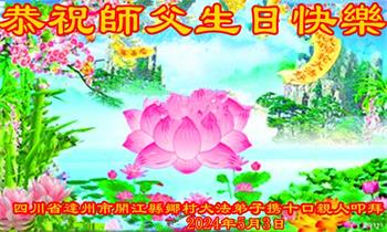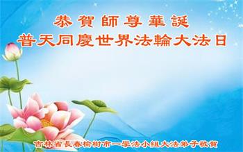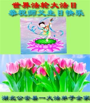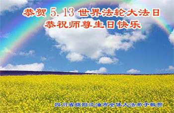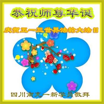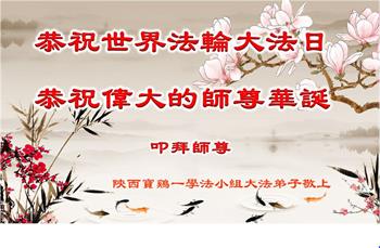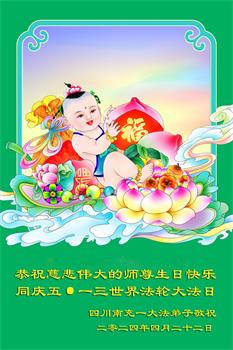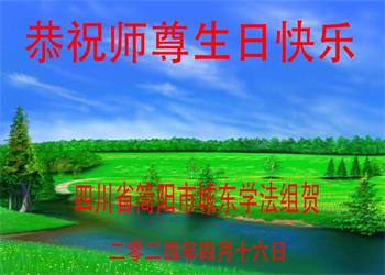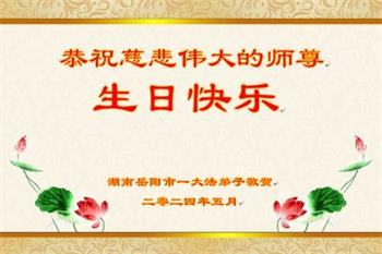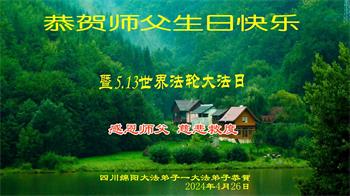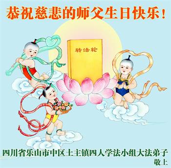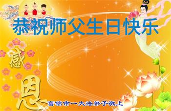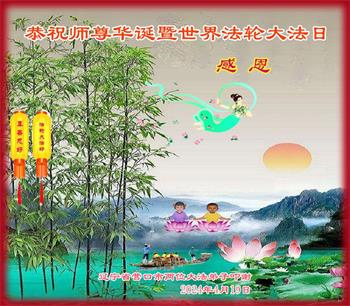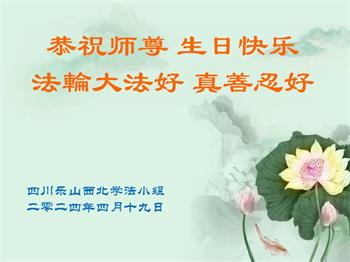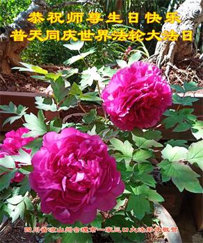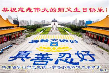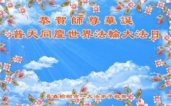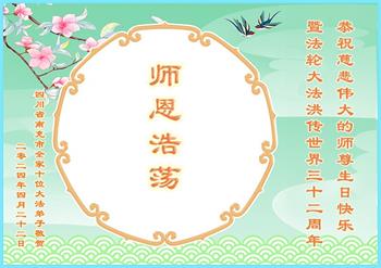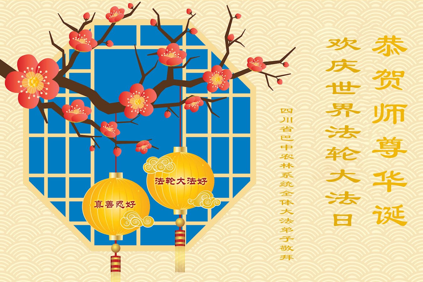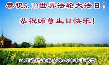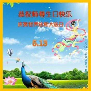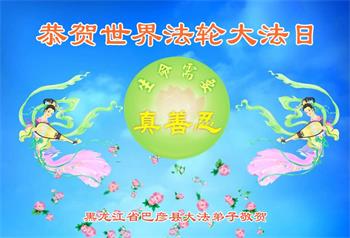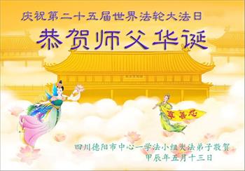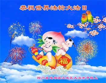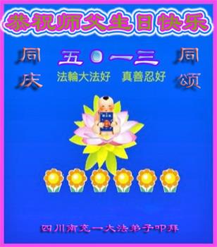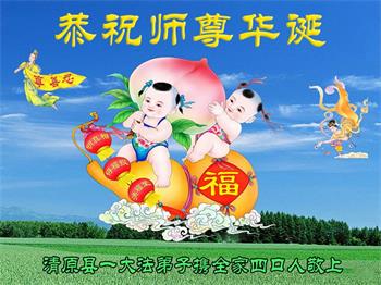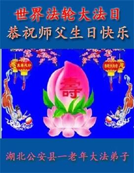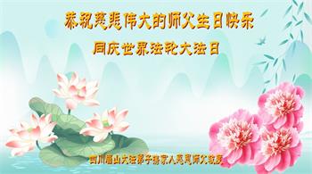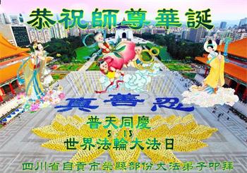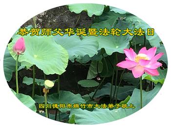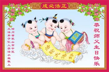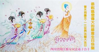 在您七十三华诞到来之际,在您传宇宙大法三十二周年之时,在第二十五届世界法轮大法日来临的时候,我们四川省巴中市农林系统全体大法弟子以万分崇敬和喜悦的心情,虔诚的跪拜在您的法像前,恭祝师父生日快乐!庆贺伟大的世界法轮大法日,感恩师父的慈悲苦度!