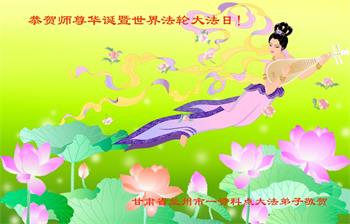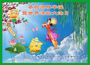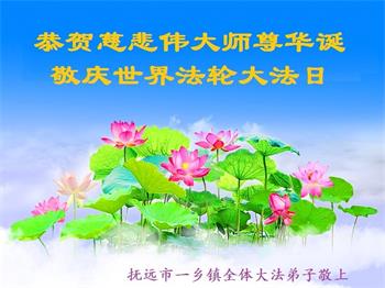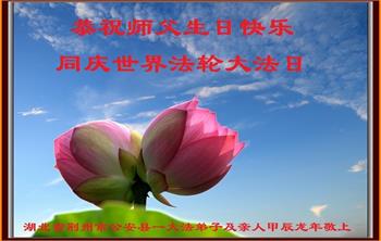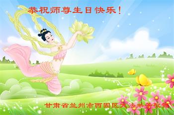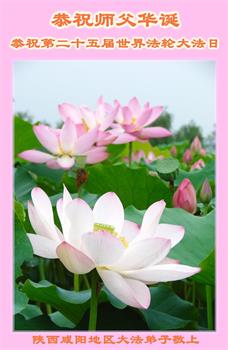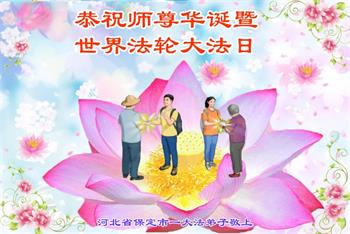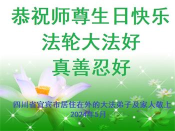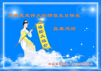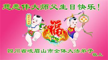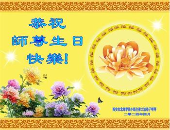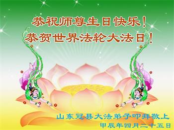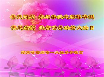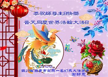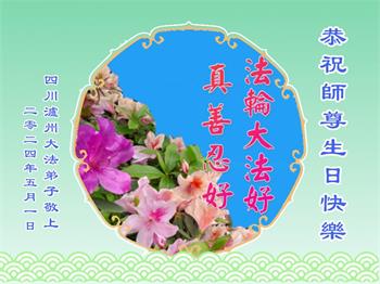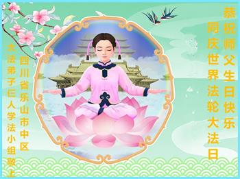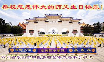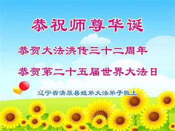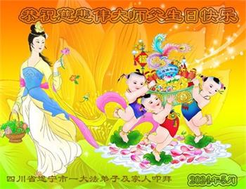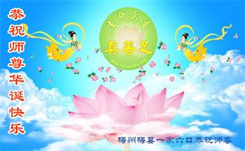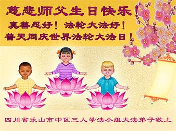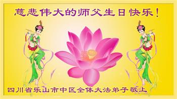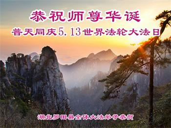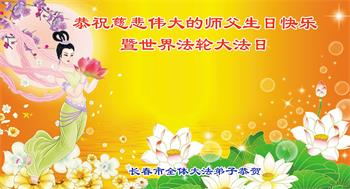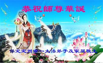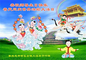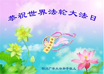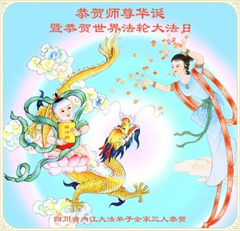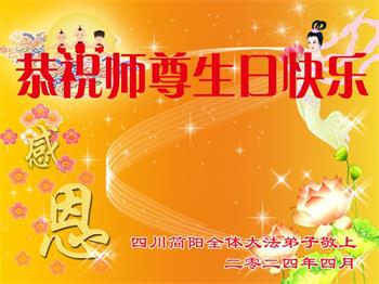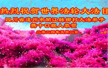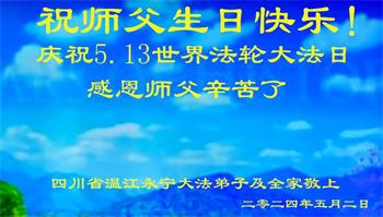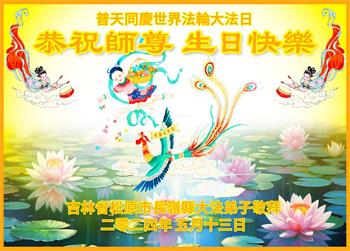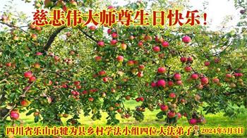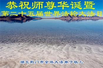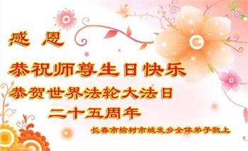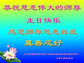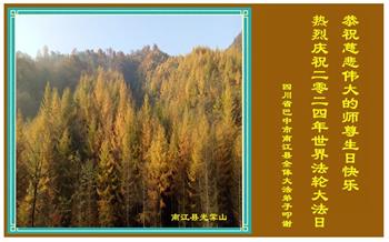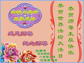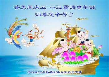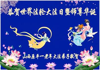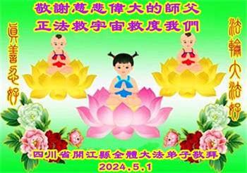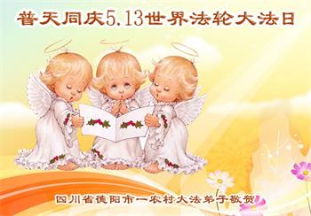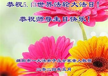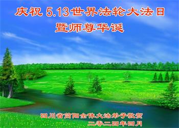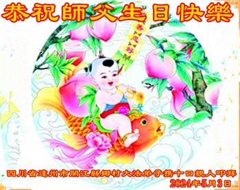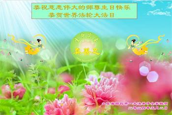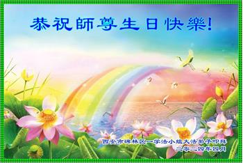 在您七十三华诞到来之际,在您传宇宙大法三十二周年之时,在第二十五届世界法轮大法日来临的时候,我们四川省巴中市农林系统全体大法弟子以万分崇敬和喜悦的心情,虔诚的跪拜在您的法像前,恭祝师父生日快乐!庆贺伟大的世界法轮大法日,感恩师父的慈悲苦度!