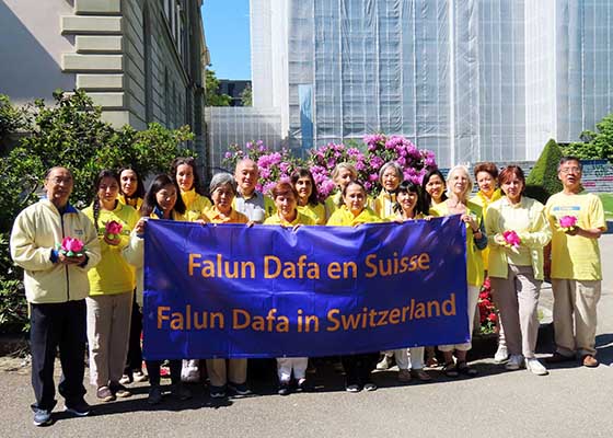 五月十一日,瑞士法语区的法轮功学员以集体炼功、弘法、学法和交流等形式庆祝世界法轮大法日,并恭祝伟大的师尊生日快乐!