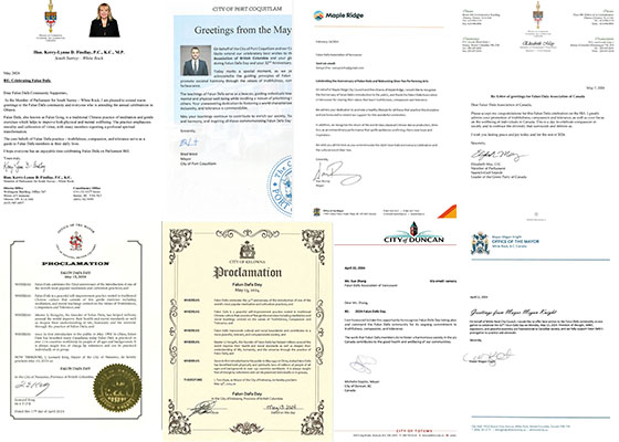 加拿大卑诗省的国会议员和多个城市市长先后颁发褒扬令或贺信,赞扬法轮大法给当地人带来福祉,并有多位市长宣布当天为该市法轮大法日。